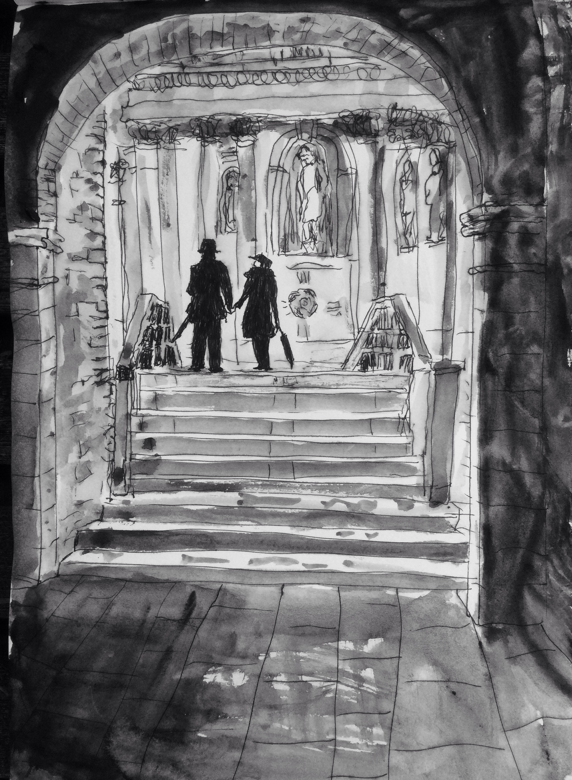 Another drawing based on a photo I took in Venice in February. Of this stylish couple walking over a bridge. I used some extra watercolour black to fill in some of the shadows, perhaps I overdid them a bit, knowing when to stop is a lesson I still have to learn.