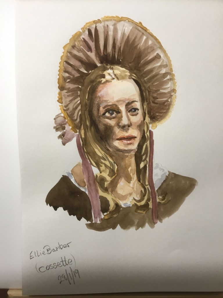 28 January 1 January 28, 2019 Written by Roberts31.com A watercolour portrait of Cossette from the BBC adaptation of Les Mis as played by Ellie Bamber. I am afraid I messed up the shadows on her face by using too much blue in the wash. Share this: Click to share on X (Opens in new window) X Click to share on Facebook (Opens in new window) Facebook Like Loading...