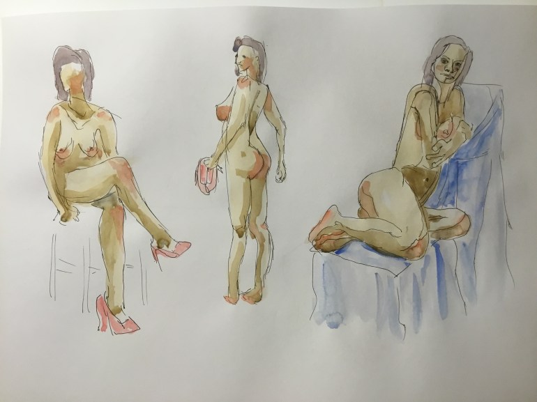 Home from Jersey today and back to work tomorrow. I am out for the next couple of evenings but I hope to find time to do the figure drawing, probably in pencil without the watercolour as that takes time. Same format tonight, three one minute poses, two of two unites and one five minute. The two minute poses on the left seemed to work the best.