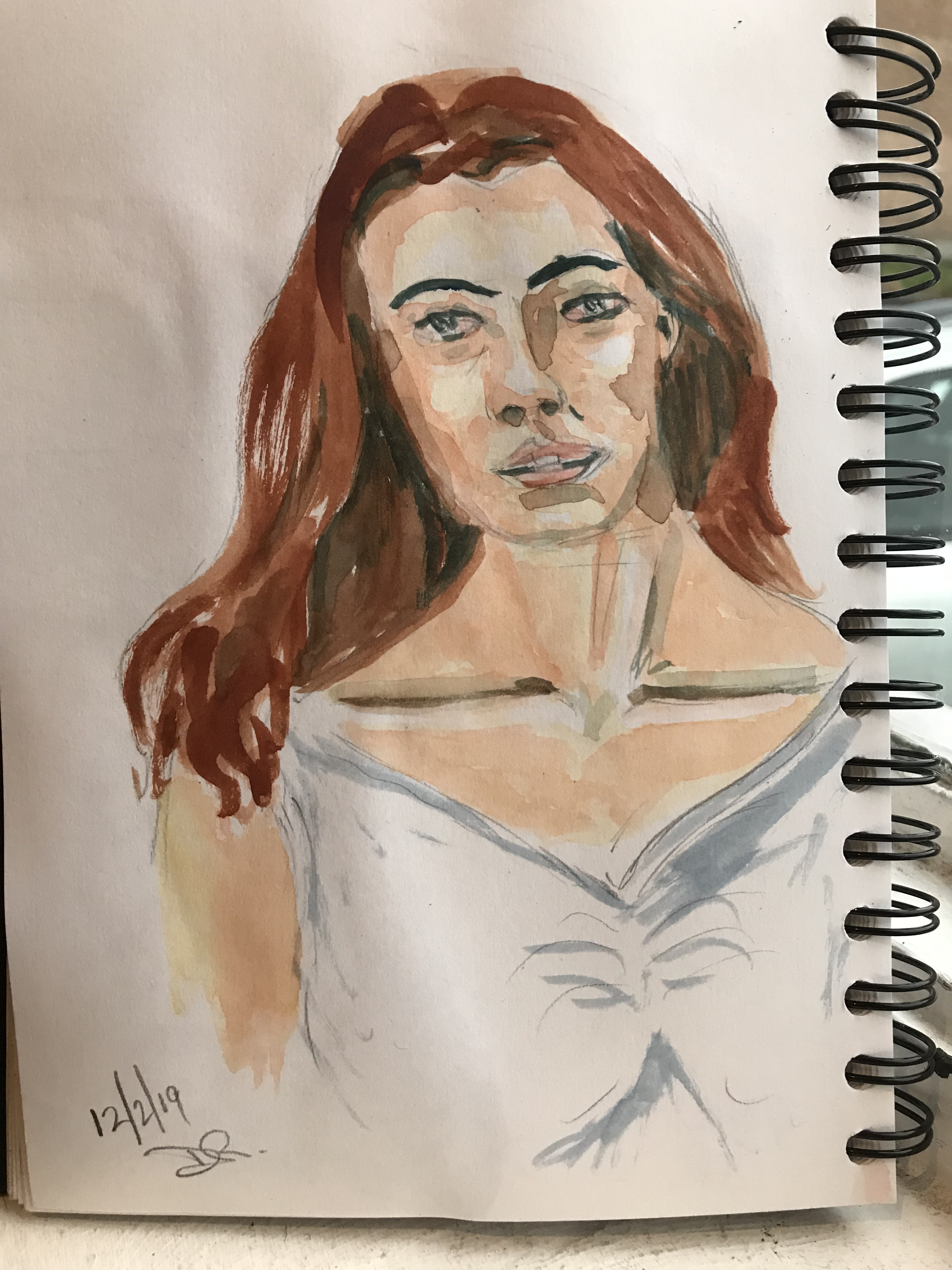 I haven’t had time to do figure drawing today and I am out tonight and tomorrow night so I will have to do two on Thursday and two on Friday to catch up. I did manage a quick portrait in the office. I can’t really draw nudes in case a customer walks in and gets the wrong idea! This was done from a random photo I found on google. I was attracted by her prominent collar bones but now I can see I should have blended them in a bit more.