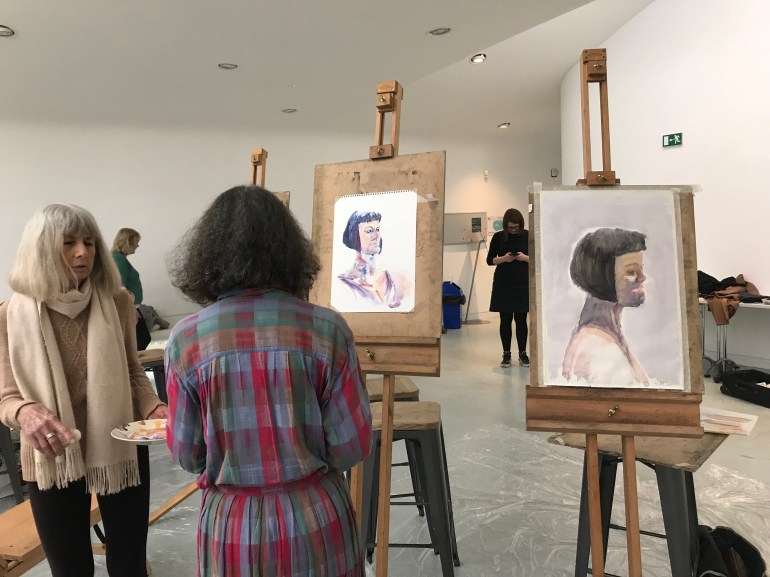 this morning we did a pencil study. This afternoon we had to paint the same model in watercolour then change our viewpoint and do a second painting but quicker and looser. I chose a position where the model was backlit.