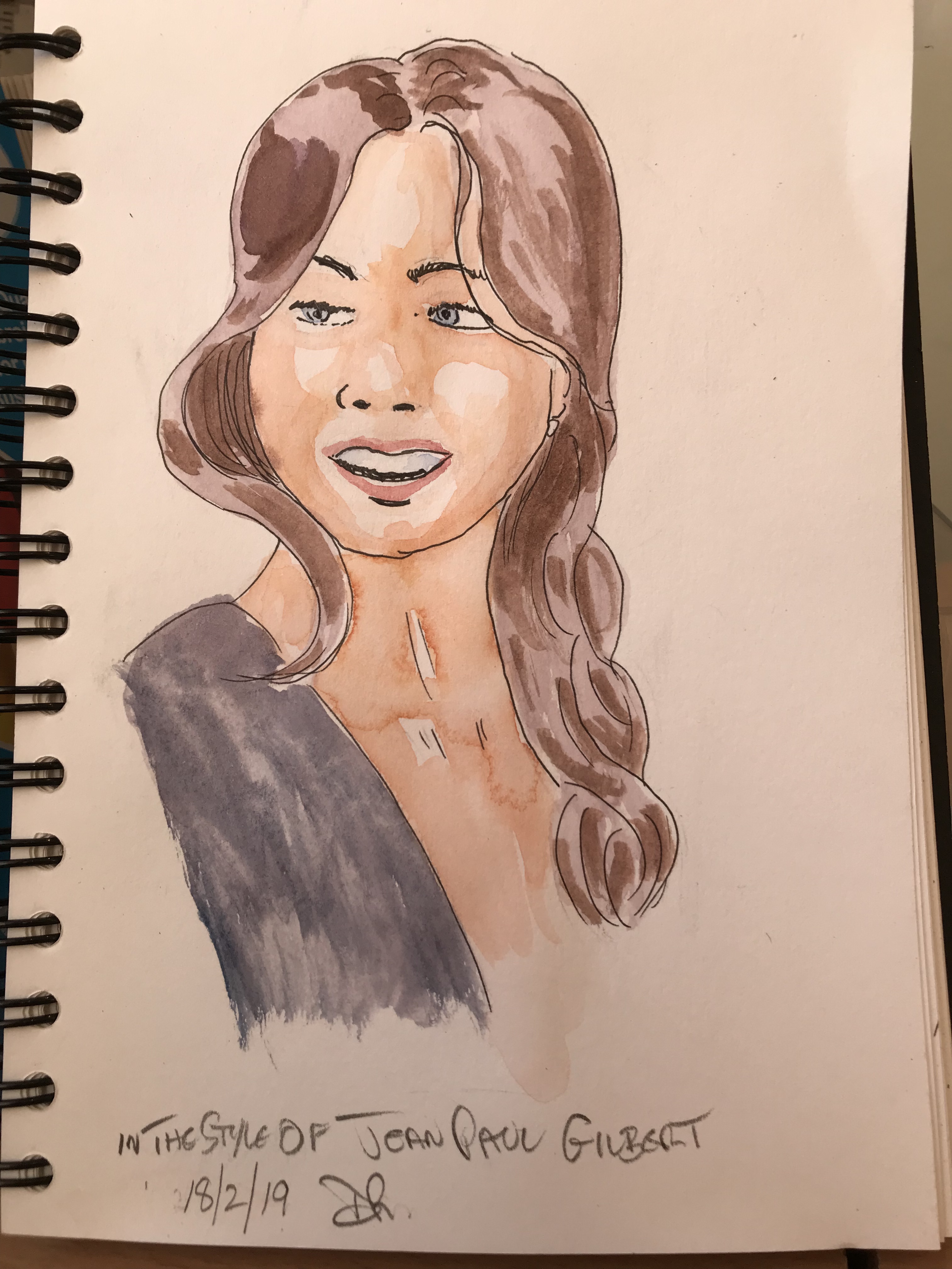 More challenging poses in figure drawing tonight but I feel it went well, especially the two minute poses. I managed to find time to do a quick watercolour portrait in a comic book style. It is loosely based on work by the french illustrator Jean Paul Gilbert, there are some of his works on Pinterest