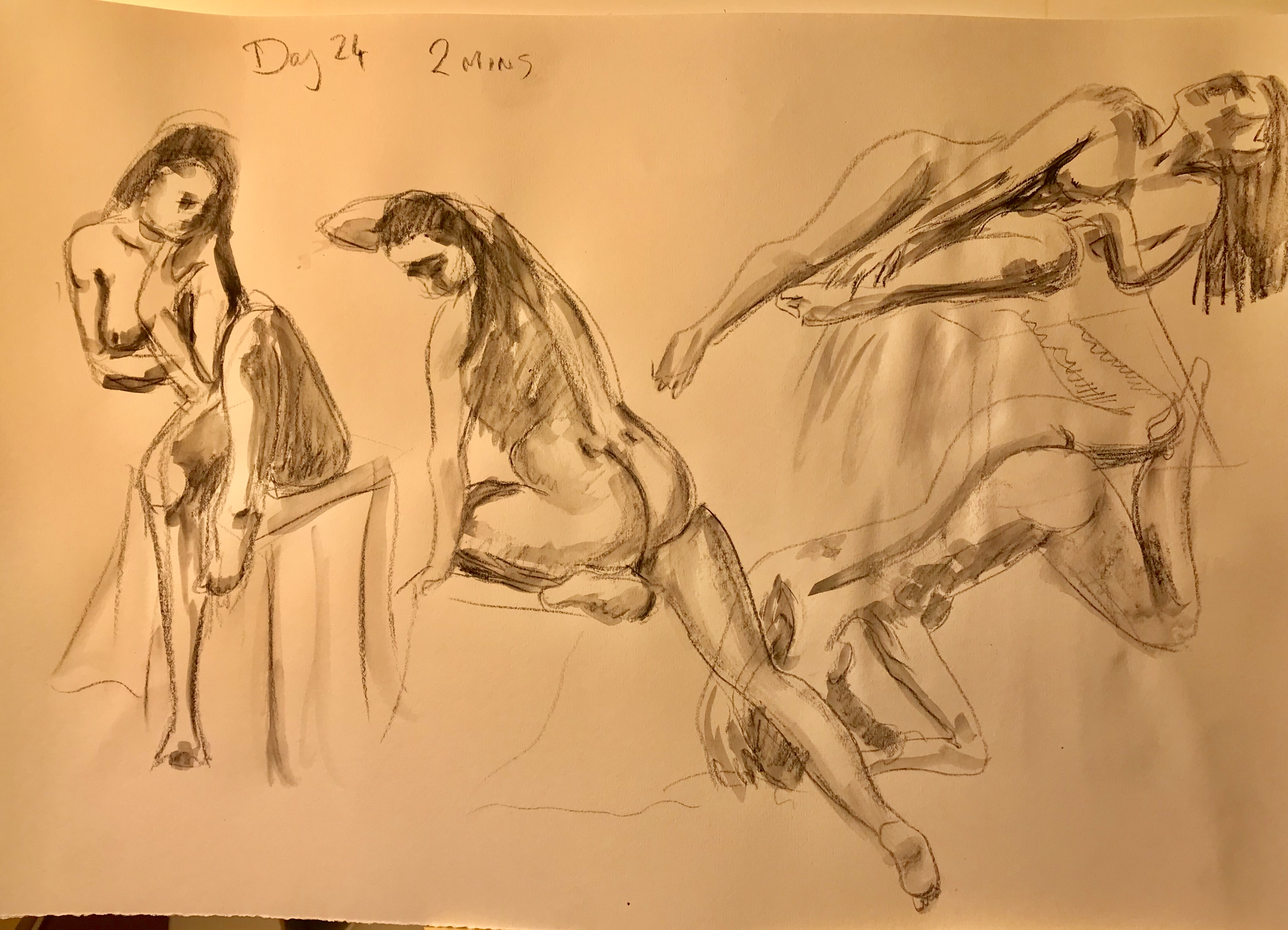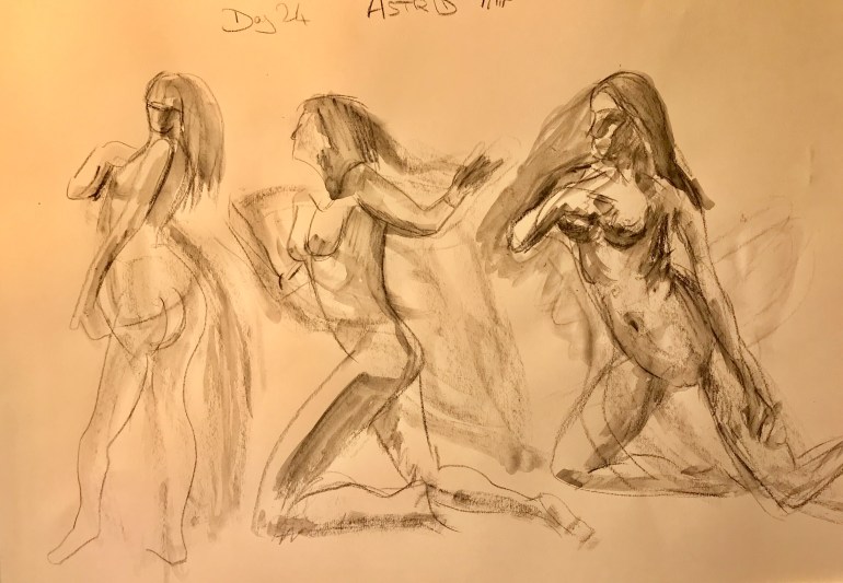 Day 24 of Figuary and I am doing it on the right day! In the one minute poses Astrid was holding a large piece of chiffon which I found challenging to draw. I used an aqua really pencil so I could add shadows afterwards. The pencil broke which is why the five minute pose was done in pencil. I added the pen and watercolour afterwards