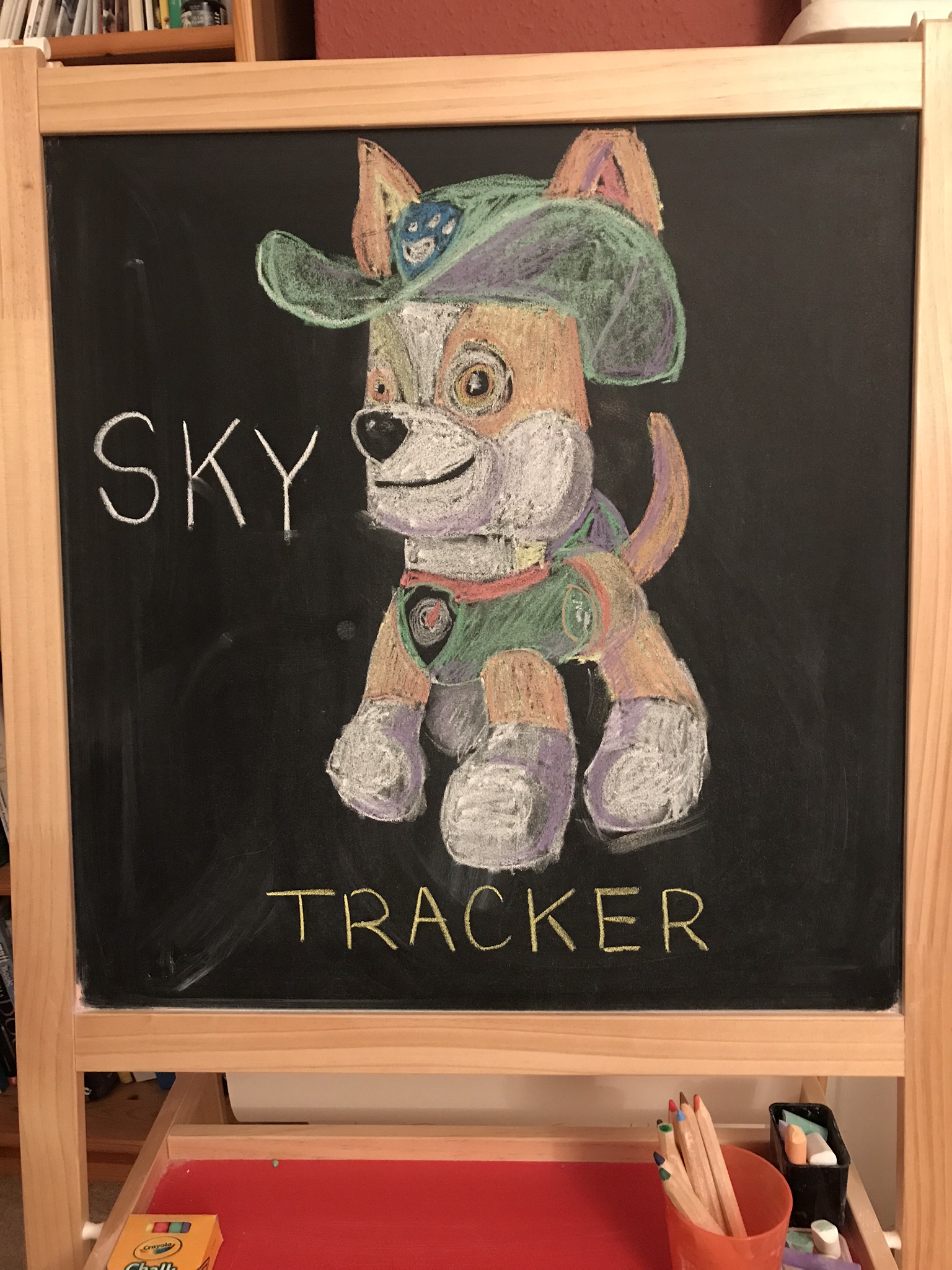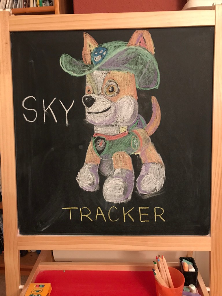 Too busy at work to do any drawing and out playing use tonight so I haven’t done any drawing today. My grandson Emmet loves Paw Patrol and likes me to draw one of the characters on his blackboard each time he visits so here is Tracker for Emmet. It says Sky because that is the next on his list so I spelt it for him.