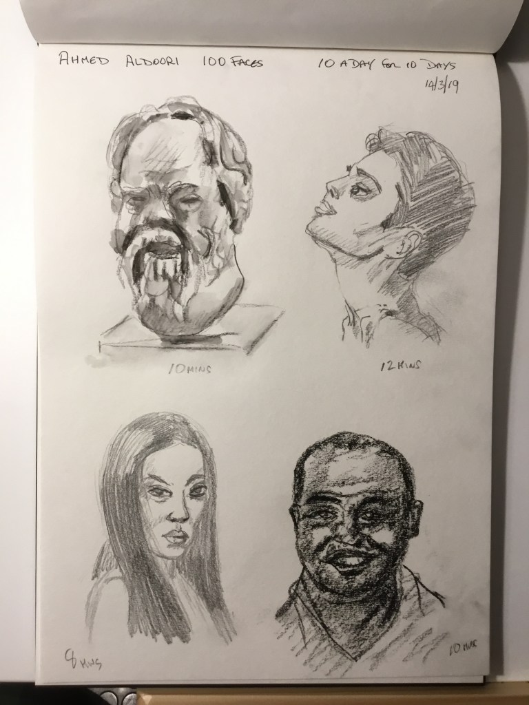 While trawling through You Tube in my lunch break I discovered a a 100 head drawing challenge. The challenge is to draw 10 quick sketches of heads every day for 10 days. There is a Pinterest page full of heads for reference and the idea is to draw quickly. They don’t have to be perfect, it is the repetition that develops the skill. I thought I might give it a try but it is hard to draw a head in much less than 10 minutes which would need nearly two hours a day! I was exhausted by the time I had done these four! I tried different media to see what works best. So I may just do a four a day challenge for the next 10 days, that should be enough! If you want to try it search for Ahmed Aldoori 100 faces challenge.