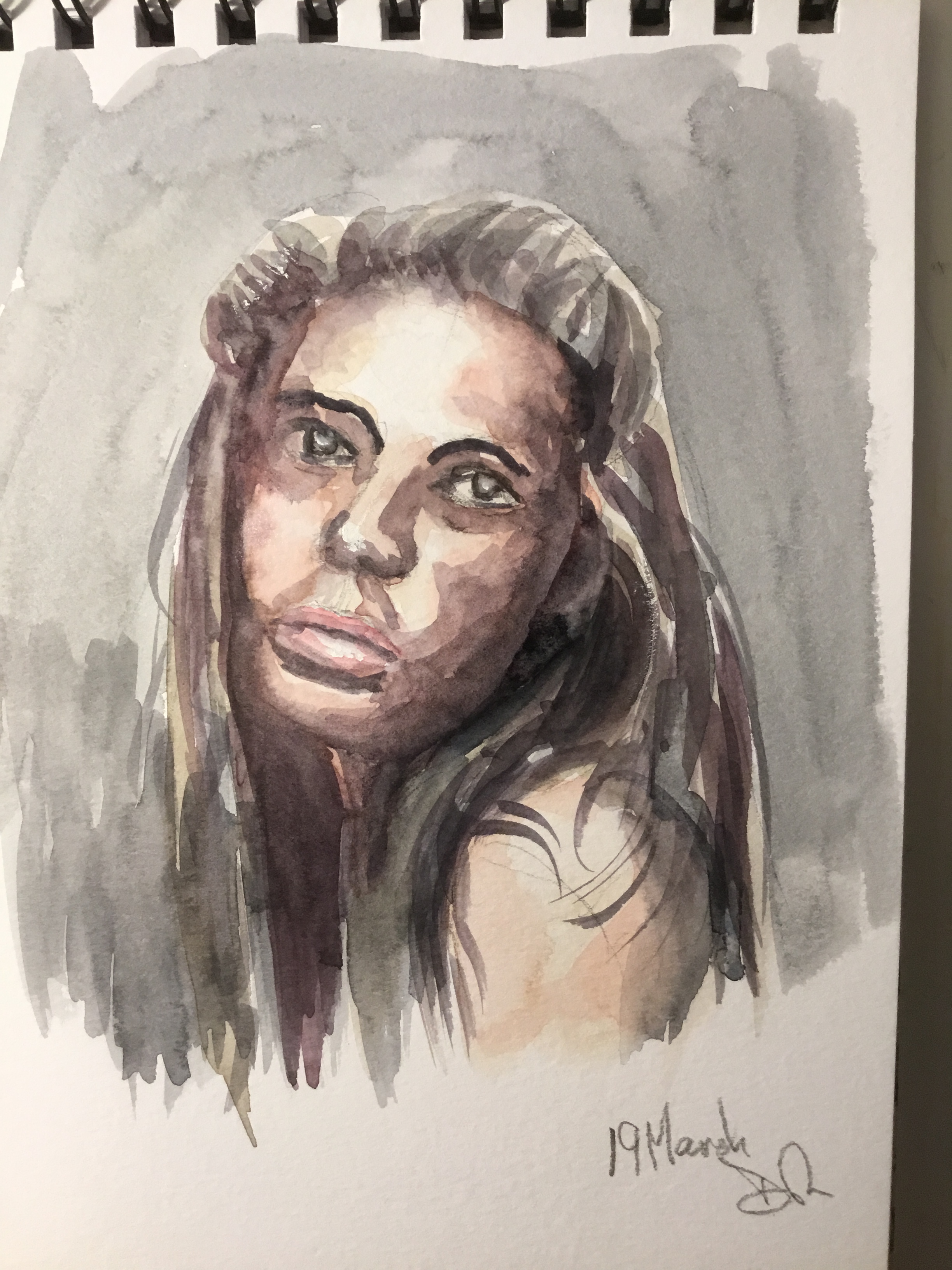 I don’t know why it has taken me so long to realise this but tonight it finally hit me. If you want to build up dark tones you have to let the previous wash dry completely otherwise the wash gets lighter not darker. I must be more patient! This was supposed to be a dark moody portrait.