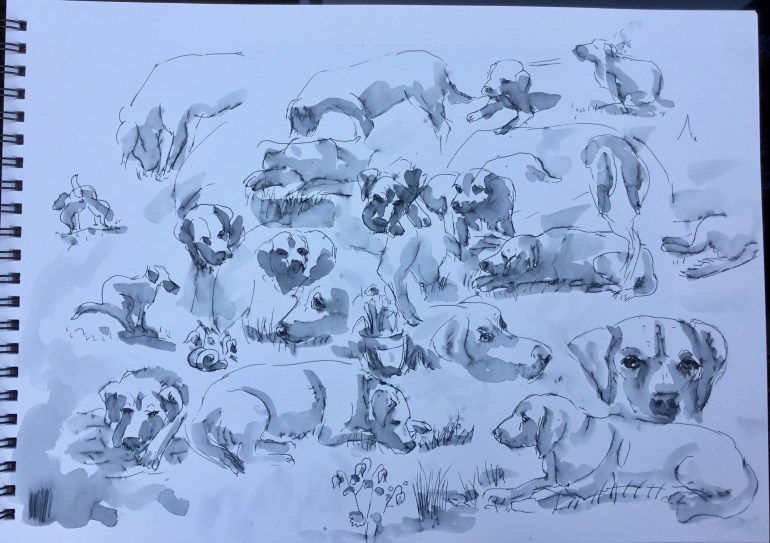Sat in the garden on a warm spring evening with a glass of chilled New Zealand cab sav sketching the dogs while they wander round the garden. Life is good.
