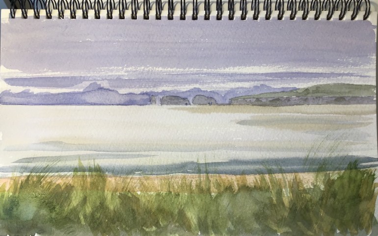 Another watercolour of Studland Bay with Old Harry rocks in the distance. I made the clouds on the horizon a little too dark and the sea may be a little too light!