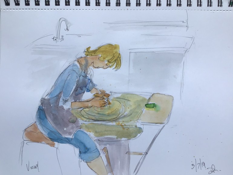 Our neighbour Vicky has a pottery studio in her garden and this morning she kindly allowed me to draw her while she was working. It was fascinating to watch a pot grow in her skilled hands although I may have made her nervous because one of them went a bit wobbly! I found it challenging because she was moving all the time but I think this captures some of the energy she puts into her work.