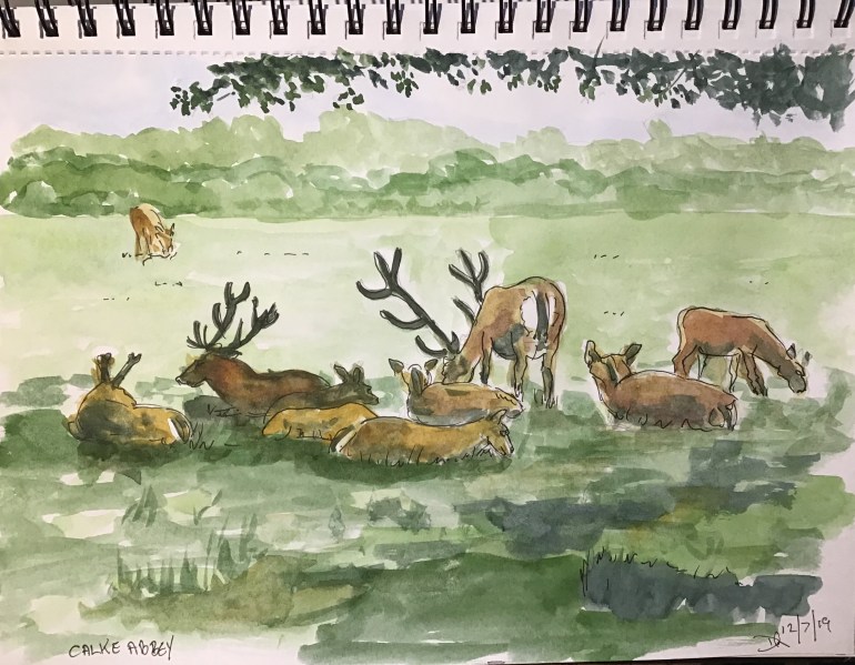 We visited Calke Abbey in Derbyshire today, a wonderful old country house that was given to the National Trust in 1985. They found rooms that been closed up after the First World War and left virtually untouched for 60 years complete with there contents. The house is kept too dark for photographs and too busy to sped time sketching but in the grounds is a superb deer park.