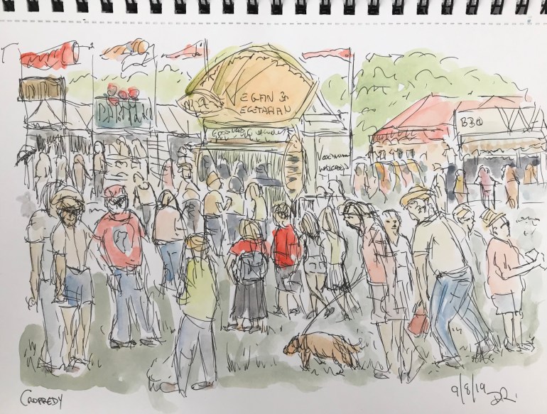Lots of short sharp showers at the festival yesterday but I managed to get some painting done in between the rainstorms. It was nice to get away from the stage and people watch.