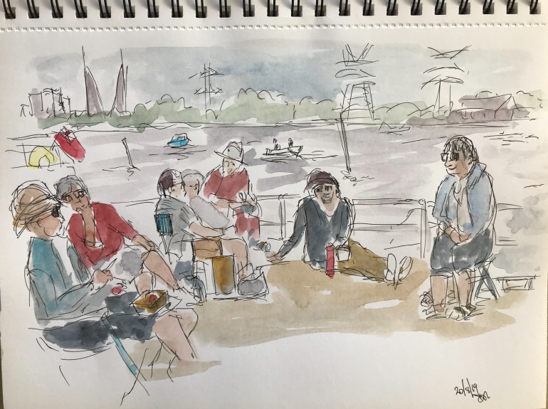 When I was out with Broadstone Art Society on Tuesday we gathered together for lunch. I couldn’t resist a quick sketch of the group chatting away while we ate. I the background is Poole’s twin sails bridge stuck in the upright position until October while they have a new bearing made for it!.