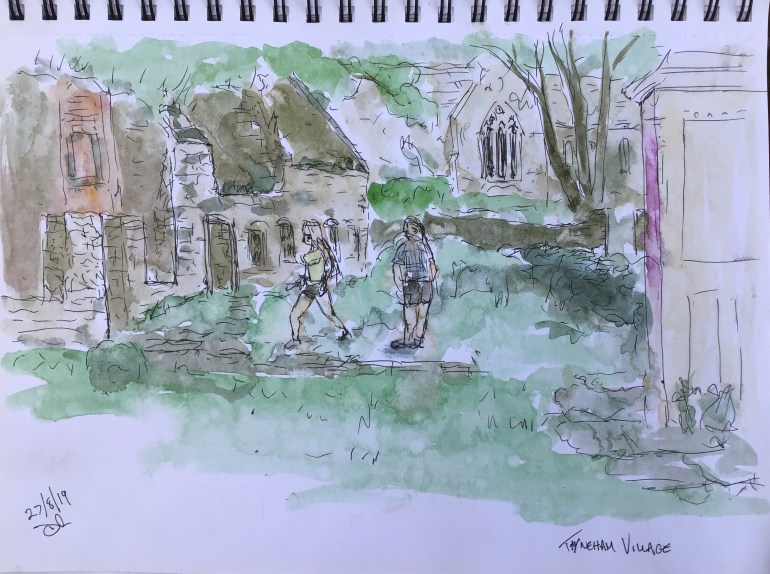 I went to Tyneham village in Dorset today with the Broadstone Art Society. The village was evacuated during the war because the army needed the land for D Day training, the villagers never returned so it has remained empty ever since. The church and school have been restored but the cottages are derelict and the thatched roofs have long since rotted away. The forecast was for a hot day but it rained really hard a couple of times during the morning.
