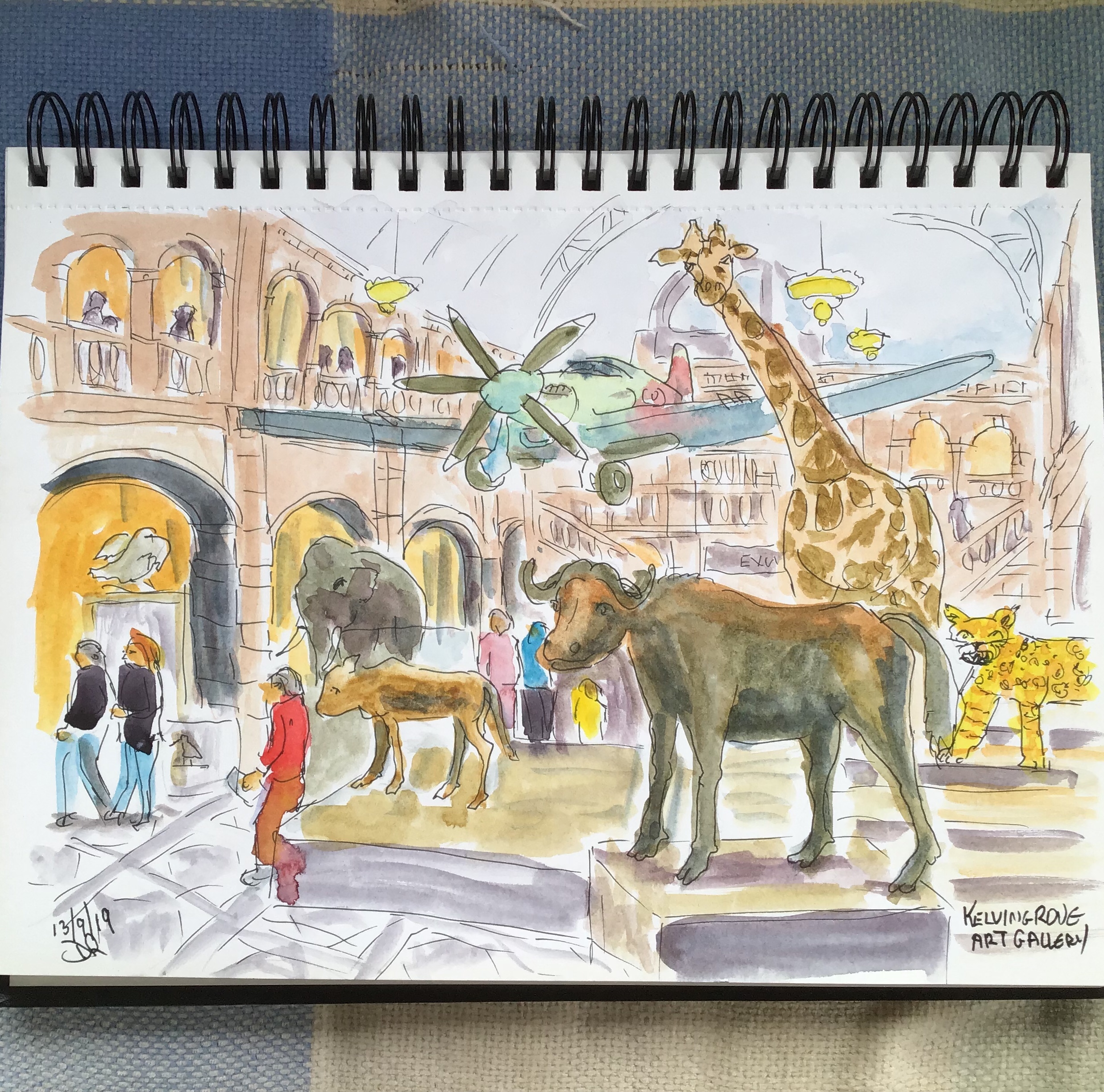 The Kelvingrove art gallery and museum in Glasgow is wonderful. It has paintings by Lowry, Renoir, Picasso, Turner, Matisse, Seurat and others that I have forgotten. However this was the gallery that I liked best, it featured an elephant, giraffe, water buffalo, cheetah and a spitfire hanging from the ceiling! It reminded me of the film Night at the Museum.