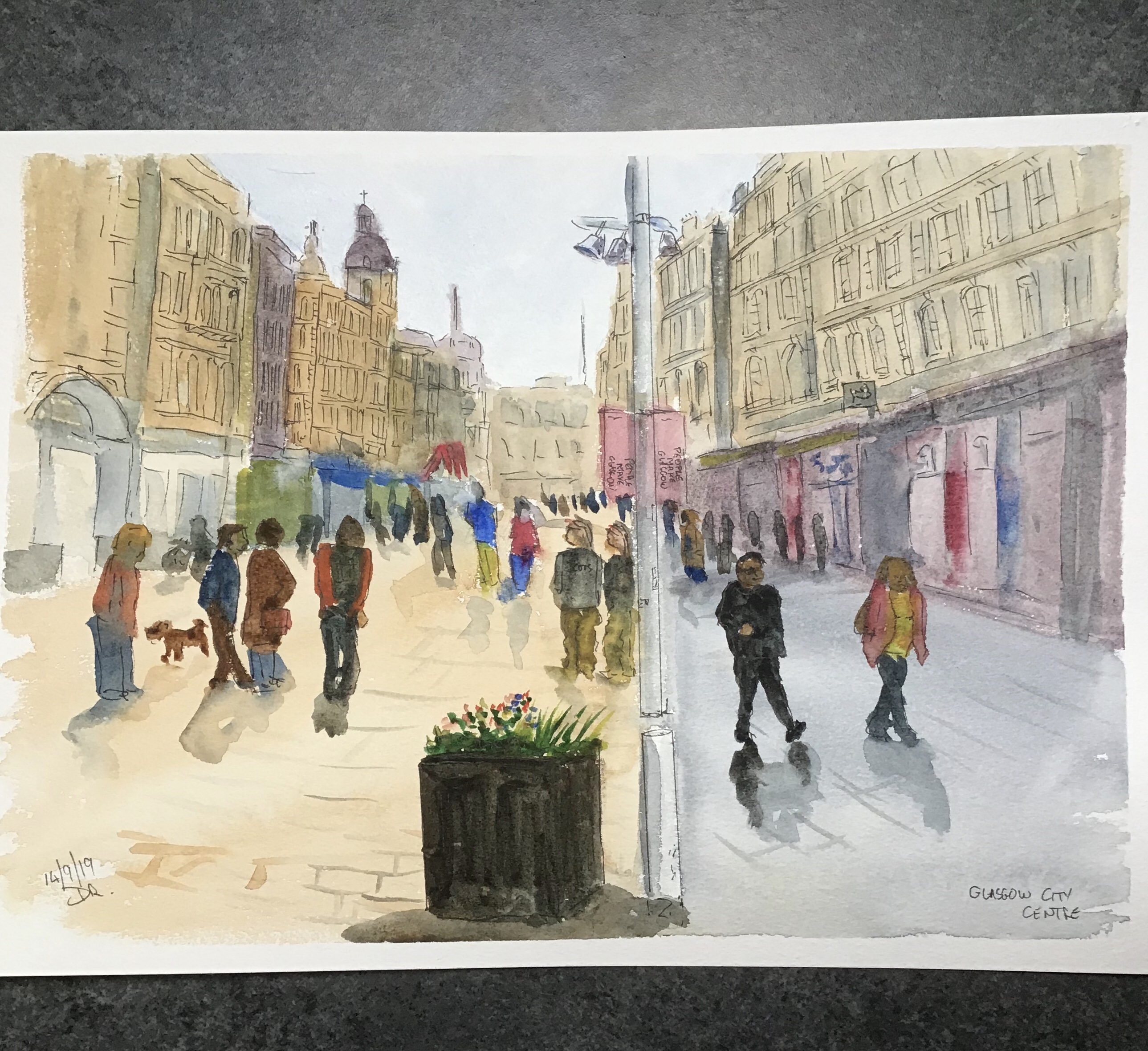 When we went to the Kelvingrove art gallery on Thursday we also had a quick trip into Glasgow shopping district to visit Cass Art. An artist’s paradise with everything you want for painting and drawing plus lots you didn’t know you needed. The pedestrianised streets are great for people watching and the tall buildings are challenging to draw.
