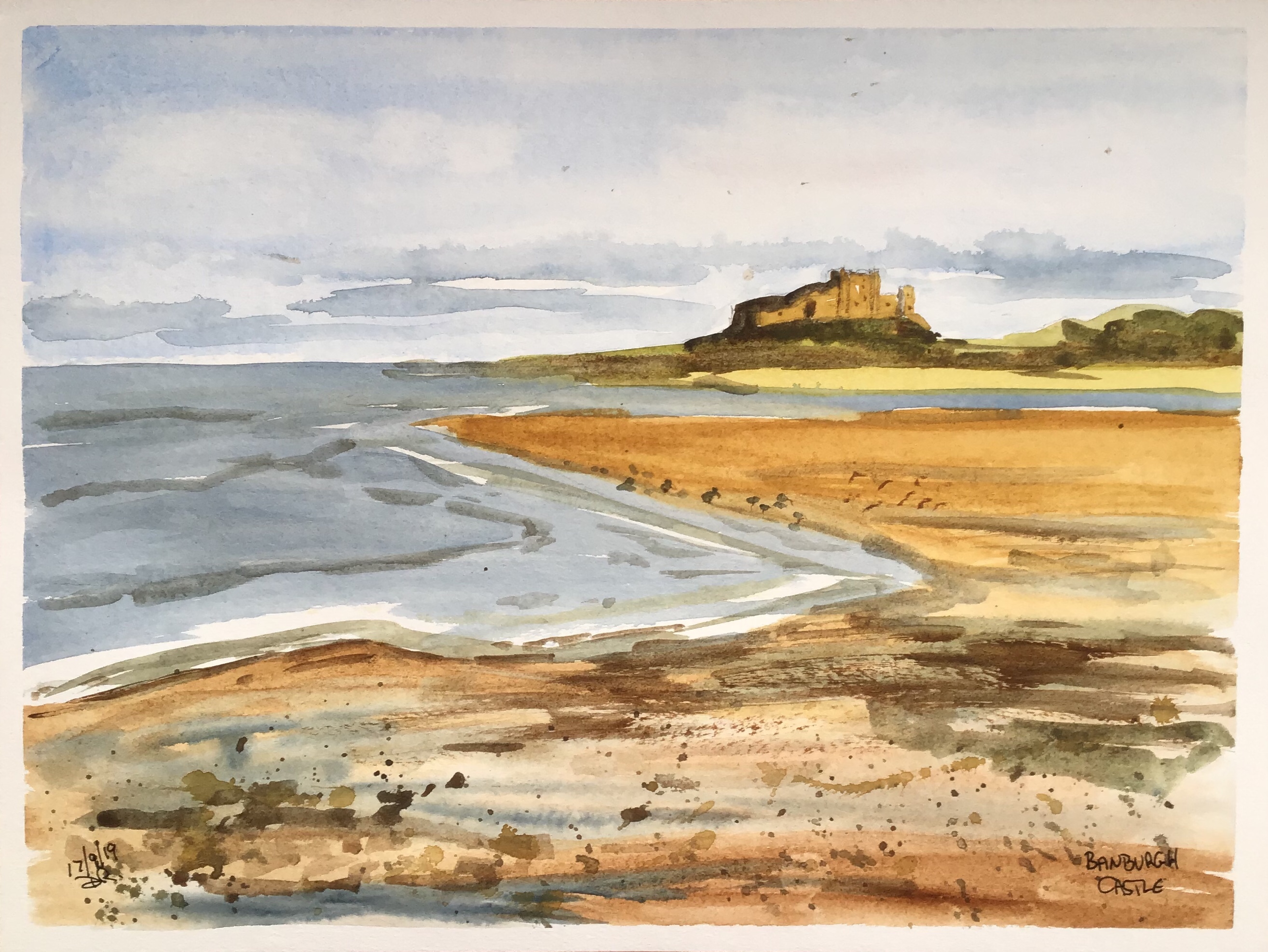I wanted to paint Bamburgh Castle on Monday but to get this view I would have been up to my neck in the sea as the tide was in! I bought a few postcards instead and painted from those, the light was better anyway.