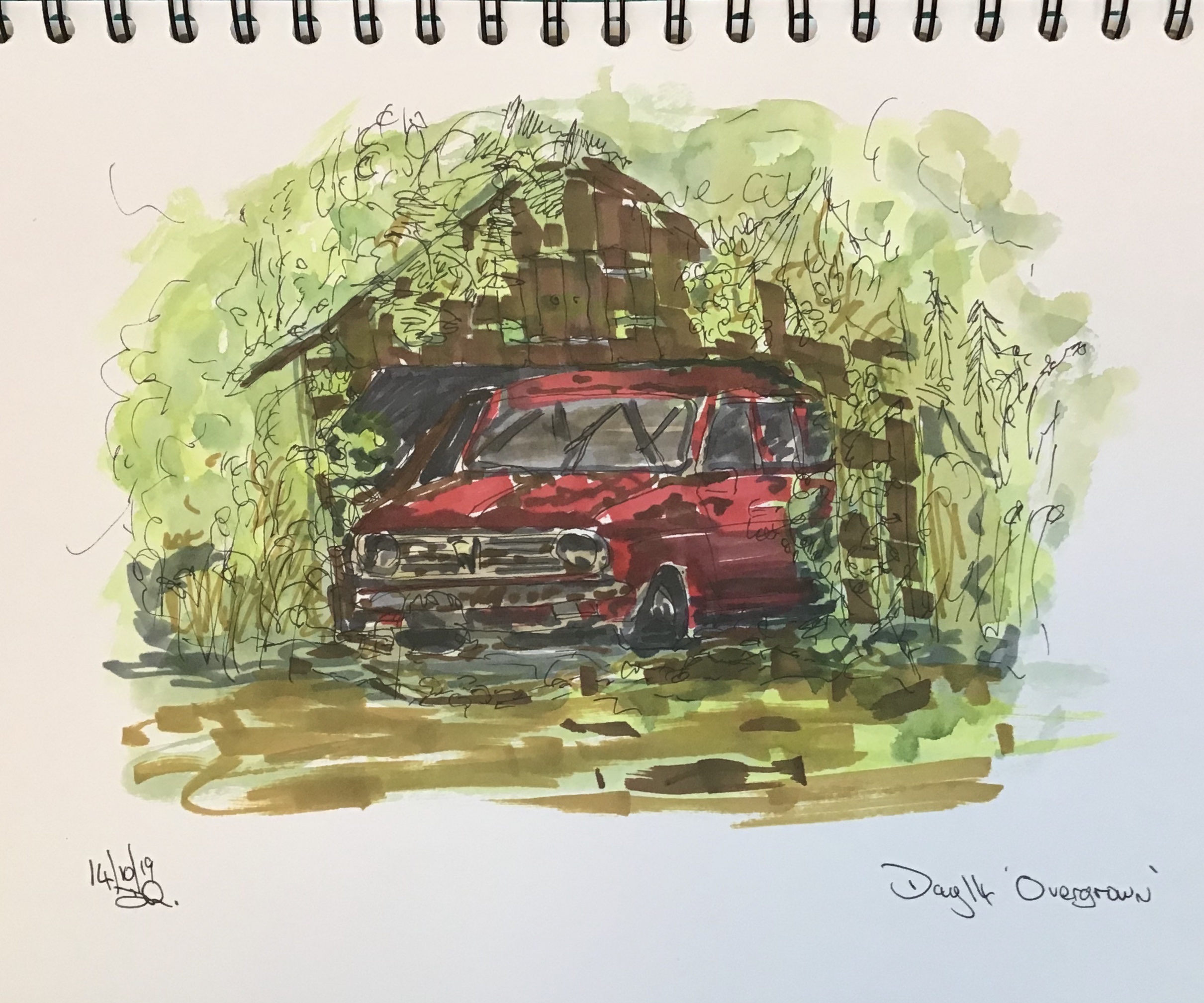 Day 14 of Inktober and the theme is Overgrown so I thought of an old car parked in a shed and left until it was so overgrown nobody would know it was there. A friend of mine once found an Austin Maxi like this in the woods at a house he was renting, the odd thing was it had a tow hitch bolted to the rear tailgate. If had tried to tow it would have pulled the boot lid off. I used some Spectrum Noir pens plus a little watercolour to colour the pen drawing.