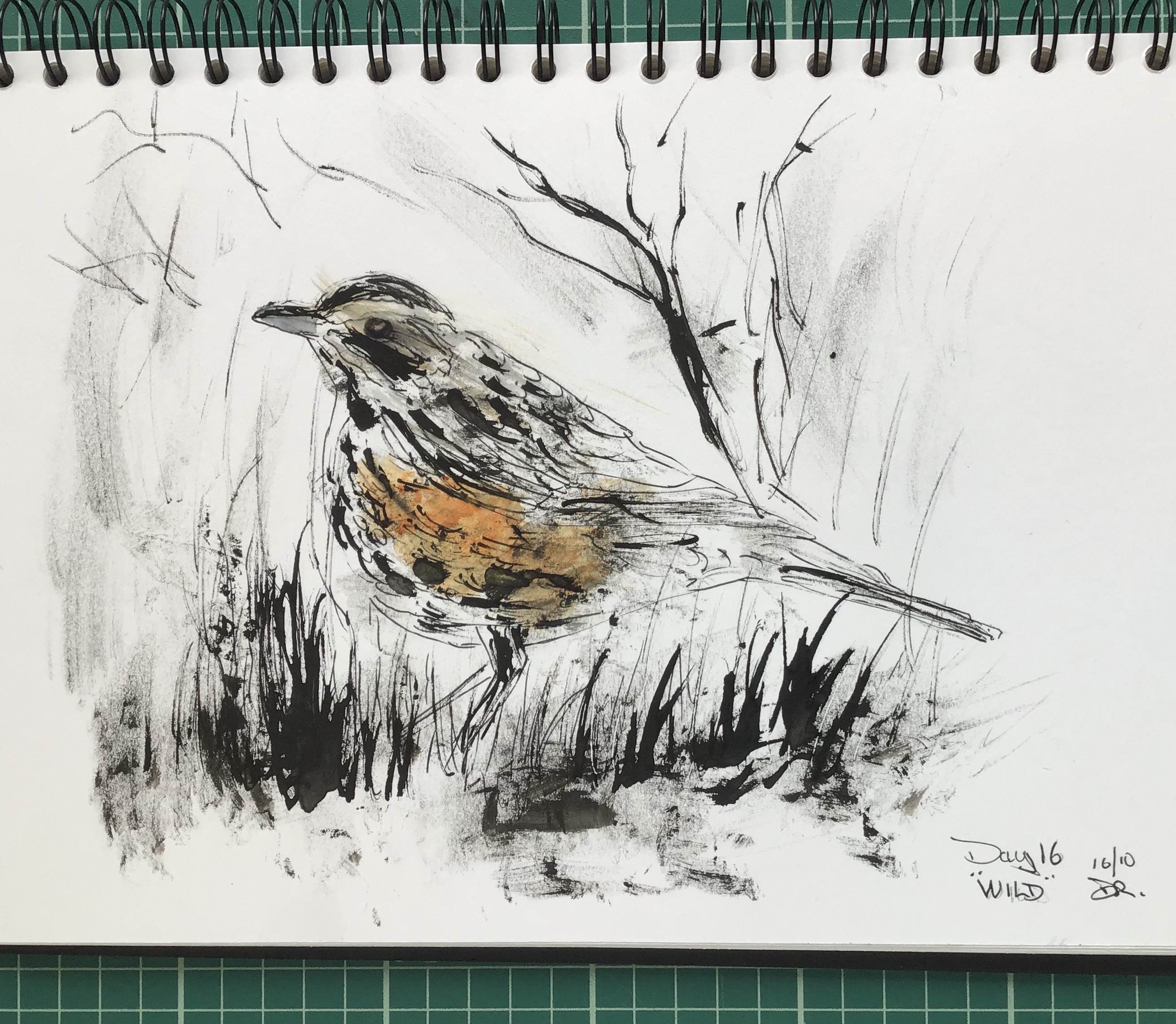 Inktober day 16 and the theme today is wild. We get lots of birds in our garden but the rarest visitor is only seen after a hard frost when they come in to town from the country to forage for berries in the woods around us. This redwing is truly wild. I drew it with a pen, sepia ink, black ink a tissue and a stick!