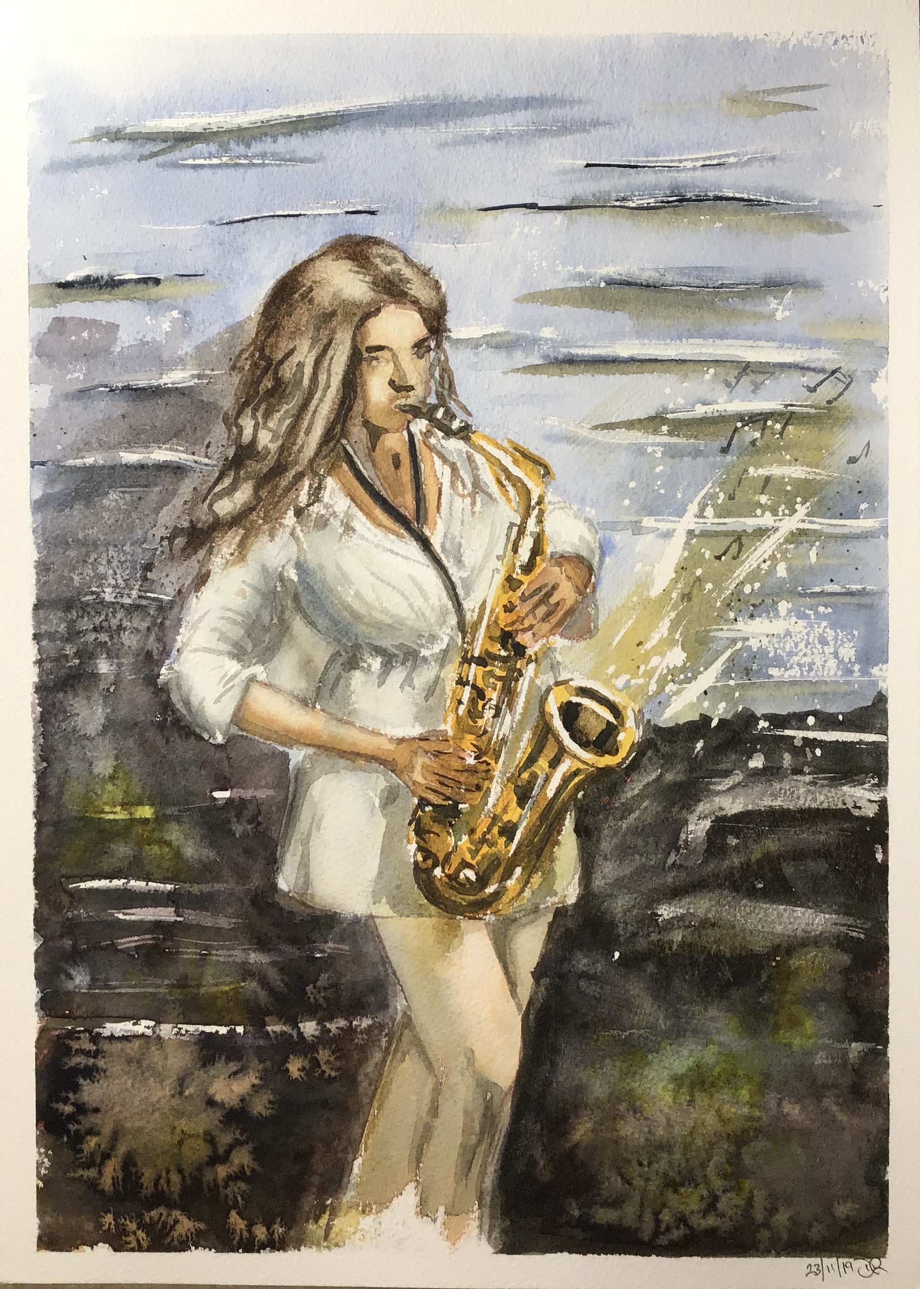 This is the second in my series of musicians. I think I overworked the background, Perhaps I should have left more white paper.