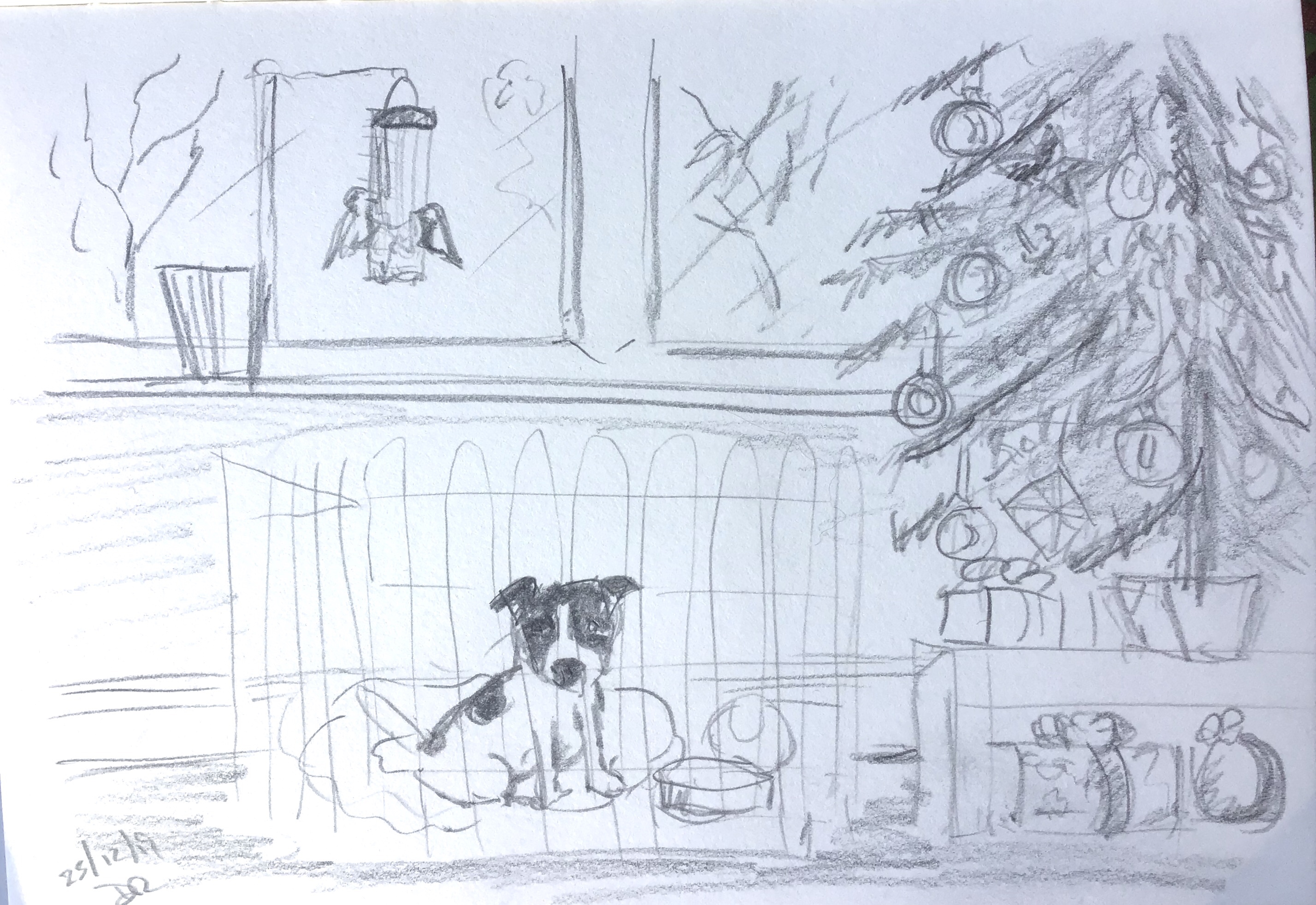 It’s a bright and sunny Christmas morning here in Dorset, the puppy is in his play pen and the birds are feeding on the nuts outside the window. Only time for a very quick sketch while Ginny cooks the Christmas salmon. I hope you all have a very happy Christmas.