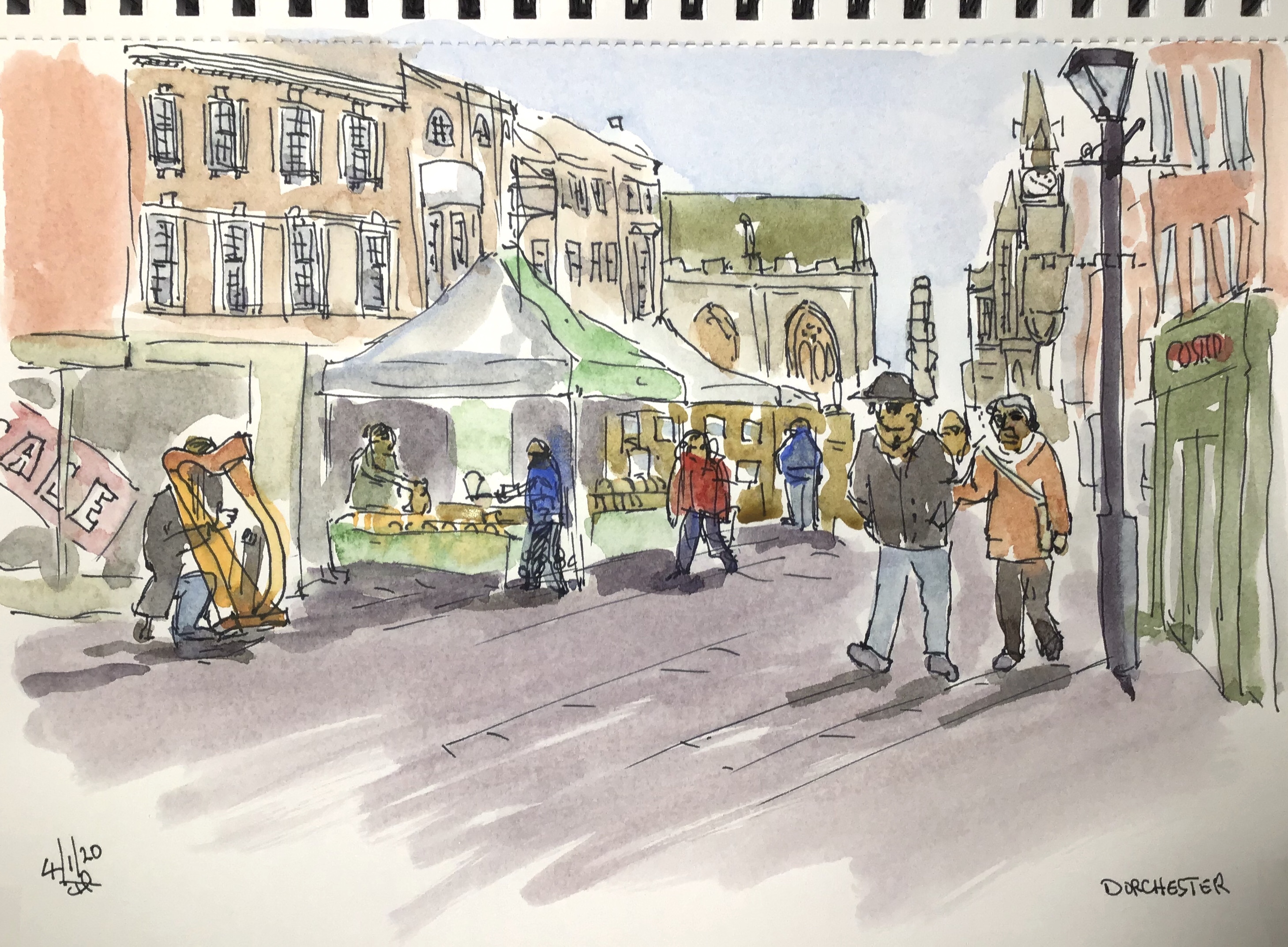 Drawing every day has become such a habit that I can’t seem to stop! We were in Dorchester this morning where they have very high class buskers, we saw this girl playing the harp and an opera singer singing Ave Maria to a backing track. I took some photos to draw later so was able to move the harpist further up the high street so I could include the church, town hall and market stalls. I was going to do the same with the opera singer but ran out of space to put him in!