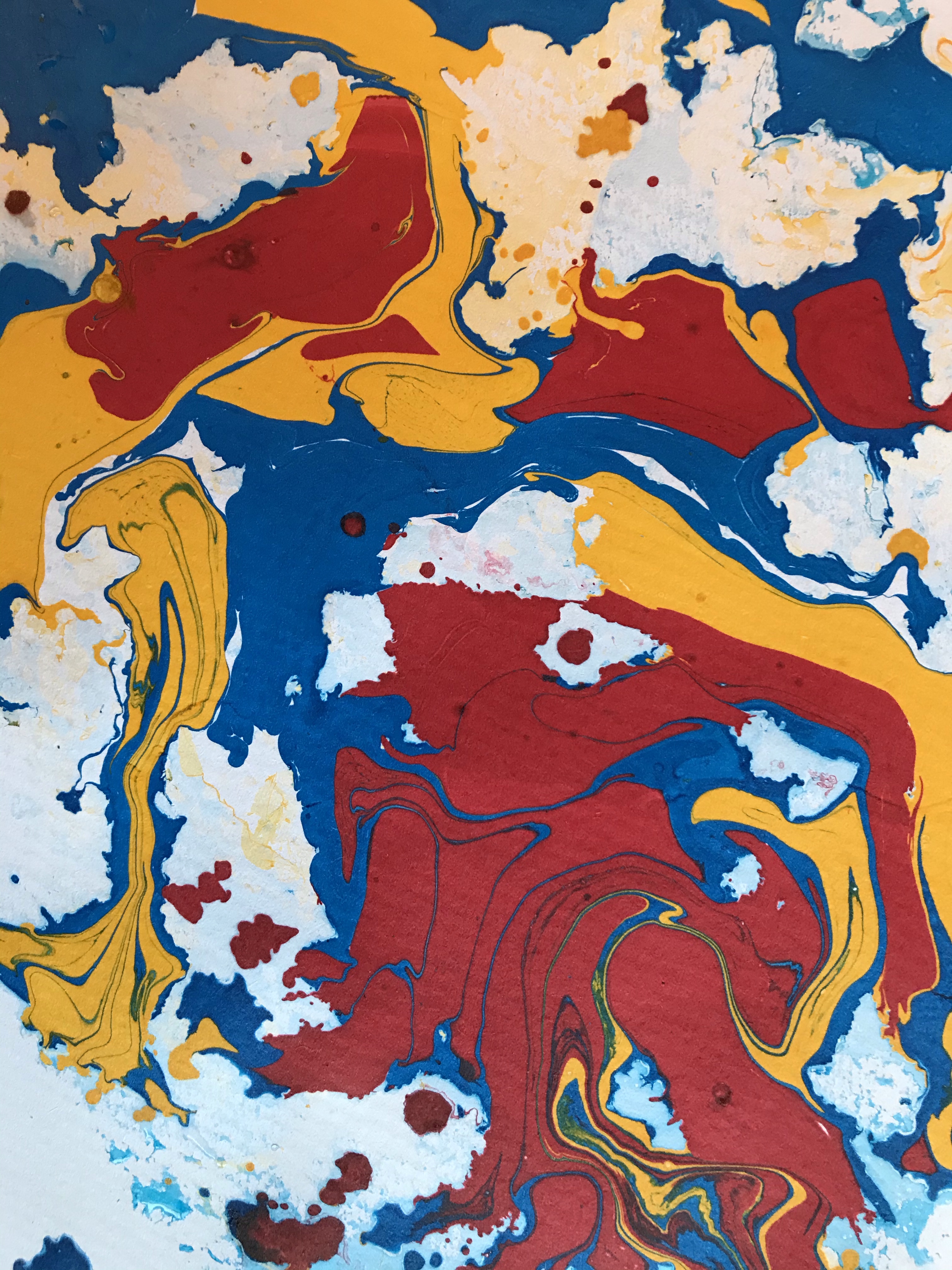 I didn’t manage to finish my painting today so here is a sample of the paper we marbled at the weekend. This is done by floating paint on water and laying the paper on top, the results are unpredictable but colourful.