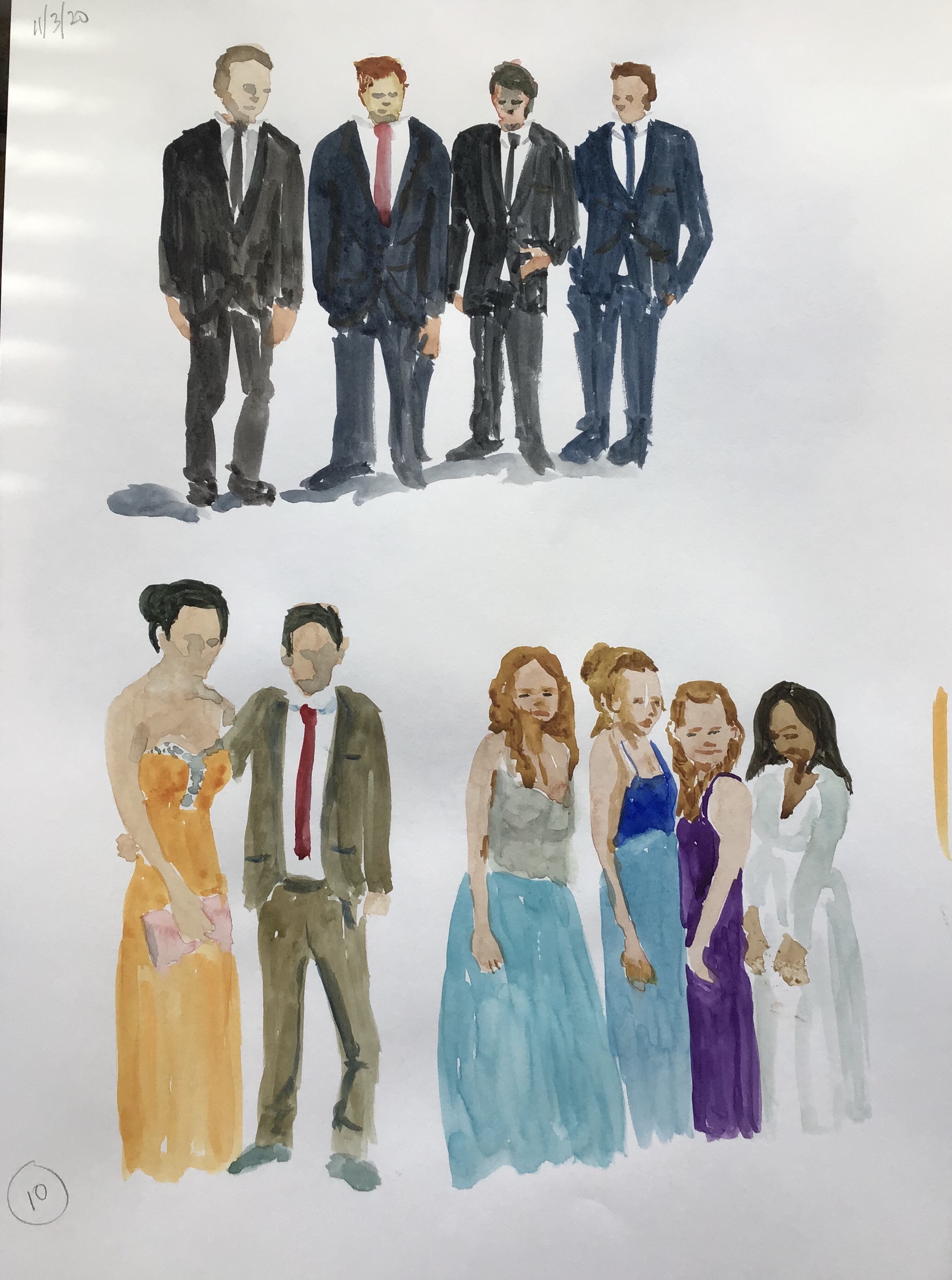 I am still a bit behind with my 100 people in 5 days challenge so I may not finish until Saturday. These are painted from school prom photos, no drawing just straight in with a brush. I need to work on the faces, I think I need to define them with shadows rather than paining eyes, nose and mouth.