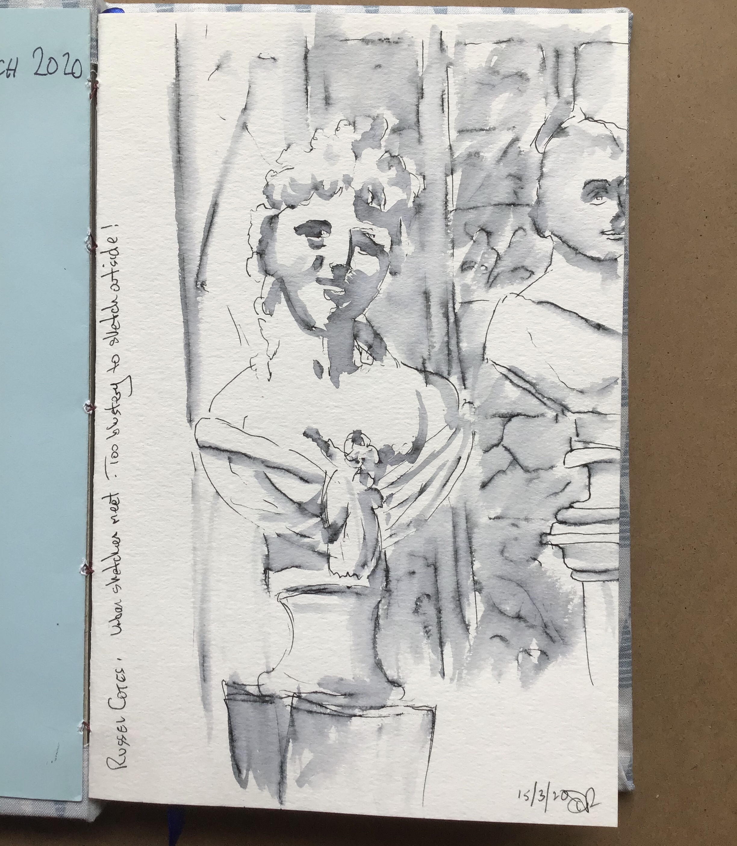 I went you the Poole and Bournemouth urban sketchers meet at the Russell-Cotes gallery this morning. It was too wet and windy to draw outside so I settled down to draw a couple of my favourite sculptures and finished with a view of the upstairs gallery. A few people have asked me about the materials I use, the pen is a pilot retractable ink pen but it could be any water soluble pen, I then use a water brush with plain water to create the wash, it is easy to carry around and doesn’t create any mess so perfect for museums and galleries.