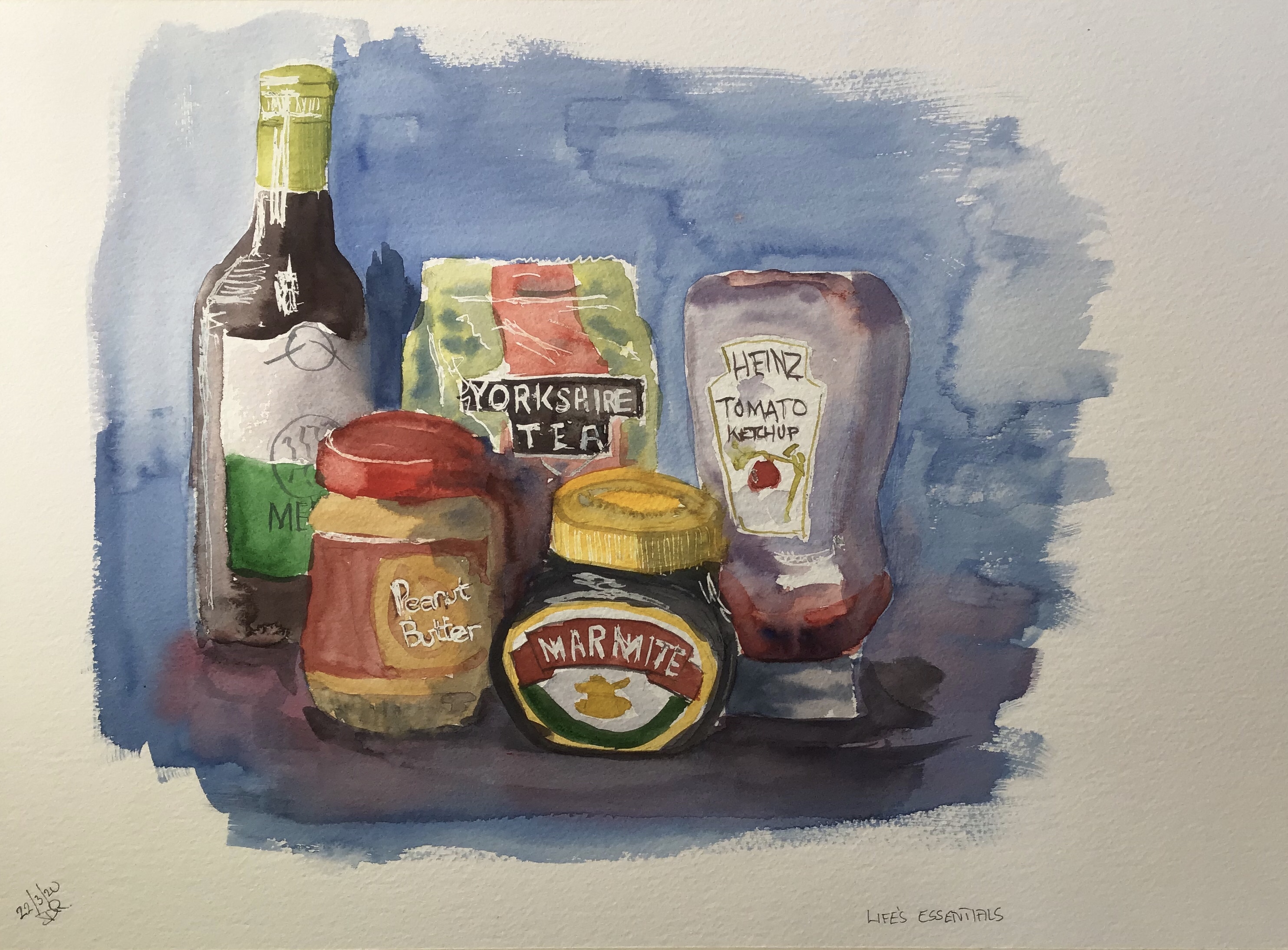 This is my effort at a challenge issued by my watercolour group Parish Art in Poole. The brief was simply to paint a still life so I decided to use some of the every day stuff that makes life bearable while we are stuck at home. I hope we can get some more when these run out.