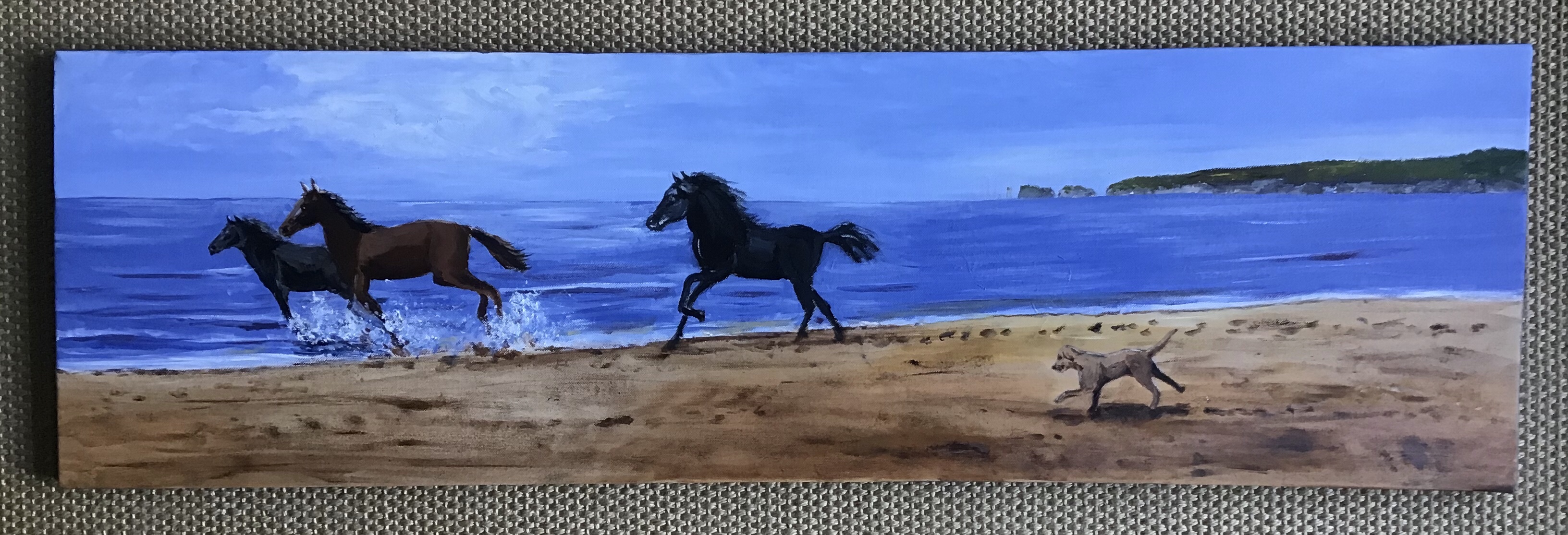 I will admit to having had a lazy day today as it’s my birthday. I walked the dogs to the beach early this morning, spoke to a few friends and family on the phone, played guitar, played the piano, baked a coffee sponge cake and finished this acrylic painting for the Broadstone Art Society exhibition which has now been postponed along with everything else. I may do some adjustments to the surf line above the dog, what do you think?