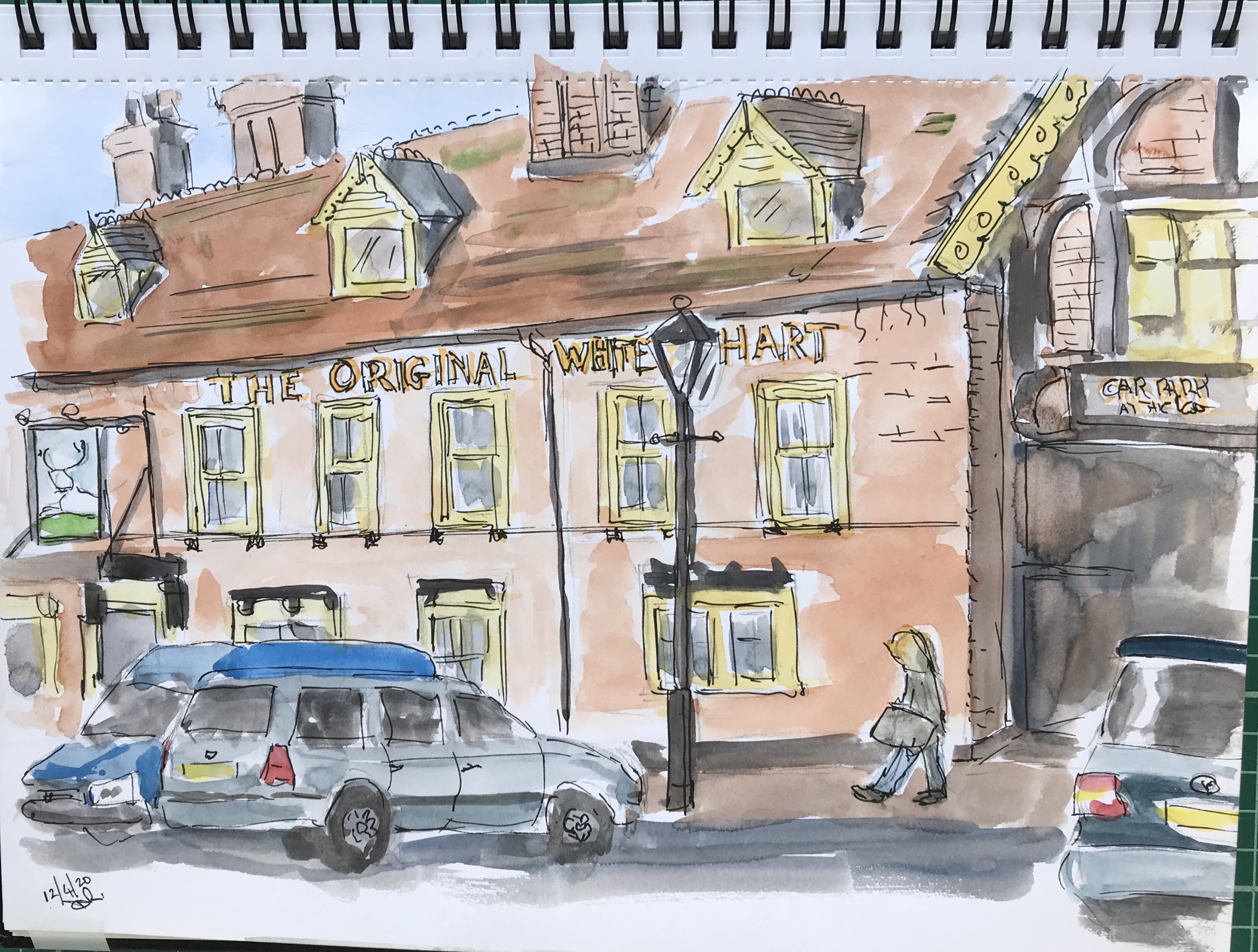 This morning our urban sketching group had a virtual meeting sketching in and around Ringwood from photos. It wasn’t quite the same as being there but the next best thing. Here is my sketch of the White Hart pub. The virtual pint went down well!