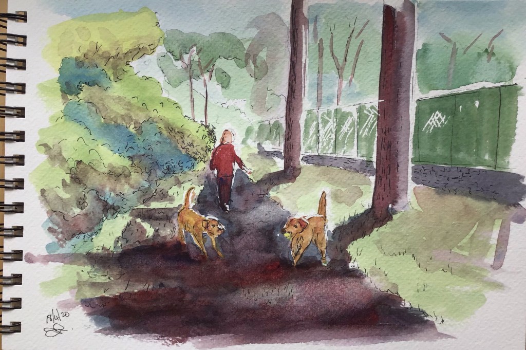 My virtual sketching is a little closer to home today, this is from a photo I took this morning while walking the dogs by the tennis courts in Branksome Chine. There were no other people about and the sun wasn’t shining so I have used some artistic licence, the dogs were there!