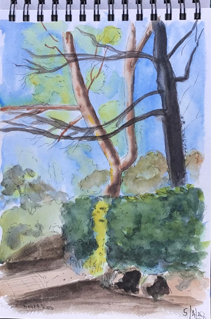 I have been working on another NHS portrait today which will take a day or so to finish so here is a watercolour sketch from a couple of weeks ago. We are lucky enough to live in an area with lots of pine trees. Their tall, straight trunks make a great contrast to the oaks and beeches and when the early morning sun hits them they glow with reds and ochre. These are in the next road and done from a phot I took during my daily dog walk.