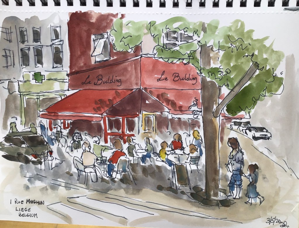 Today’s virtual sketch trip is to Leiges in Belgium. I got a bit lost and wandered around the back streets until I found this lively cafe so I stopped here for a while.