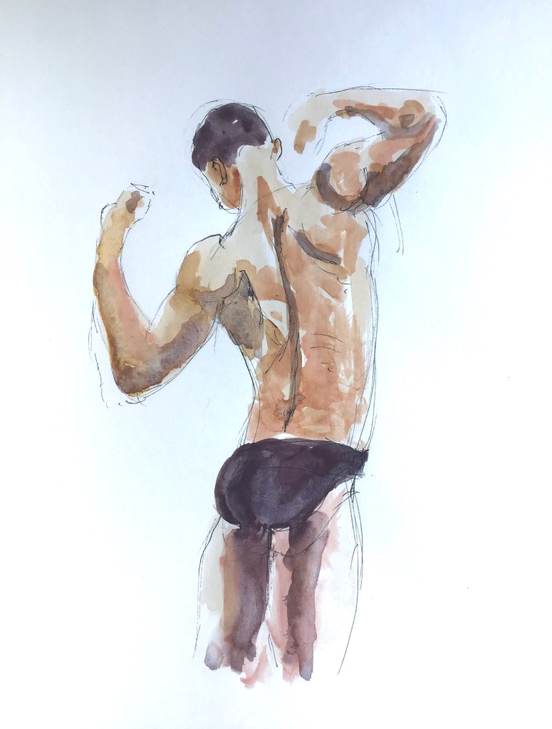 I joined an on line life drawing class this afternoon with Kenzo at Love Life Drawing. He is a very good tutor if you want to learn figure drawing and today was talking about line weight. As I like to draw with a pen I finished each model with time to spare so couldn’t resist adding a bit of colour. There was a female model as well but I shaded under her chin and it looked like a beard so I didn’t photograph that one!
