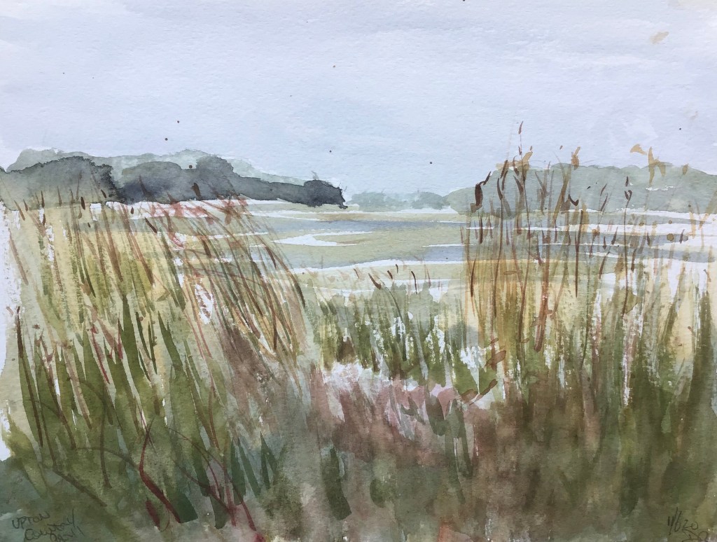 I went to Upton Country Park this morning with the Poole and East Dorset Art Society for our first plain air session this year. It was windy and overcast but I managed a quick painting of the salt marsh before walking back to the more formal gardens to paint a family picnicking on the grass by Upton House. Unfortunately it started to rain before I finished and the family packed up and went home. I did the same but before I got home the sun came out again so perhaps I should have stayed and painted some more.