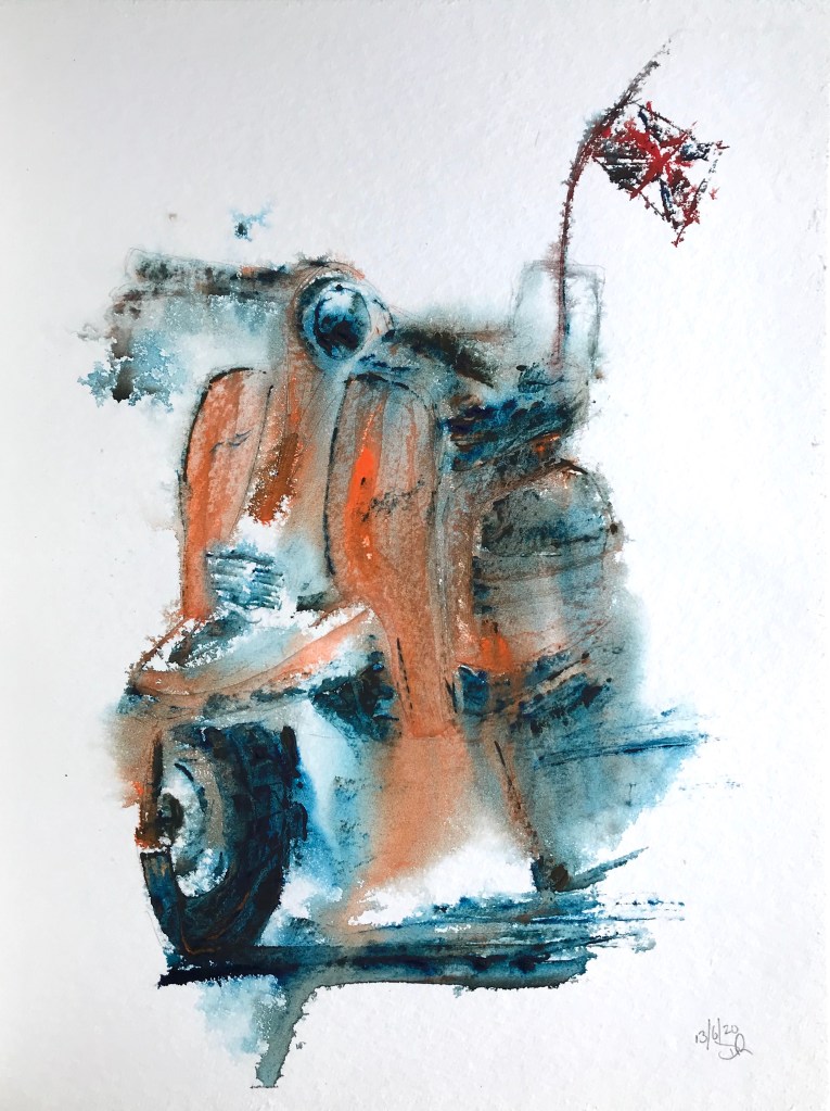 My VW painting using a credit card and a stick was well received so I have tried another. This time another transport favourite the Lambretta. I had one when I was 16, it was an older model than this with two individual seats. I used it to go to work in London for a while. In those days (1968) I only wore a crash helmet if it was raining, luckily I survived long enough to buy a car but I will save that for the next painting.