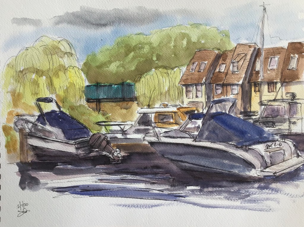 This morning’s art club outing was to Tuckton. Bridge on the river Stour in Christchurch. There is plenty to draw and paint there especially if you like boats although most of them are modern plastic ones there are still a few wooden ones around but they may feature in another painting.