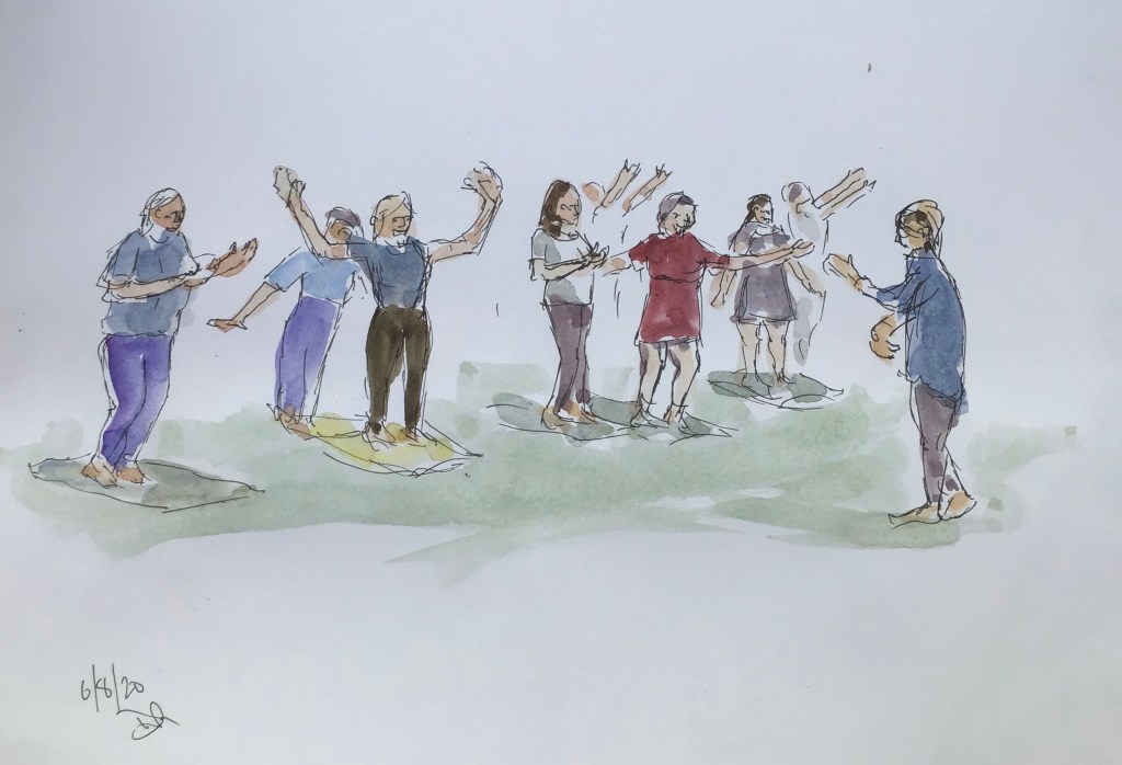 Today’s plein air outing with PEDAS was to Meyrick Park in Bournemouth. When I arrived it was overcast and drizzling and I couldn’t see any of the other artists. However I found a couple of the others and settled down to sketch although it wasn’t very inspiring. After a while people began to arrive and congregate just behind me, it turned out to be a tai chi group so suddenly I had lots of subjects doing nice slow movements in front of me so it turned out to be a good day after all.