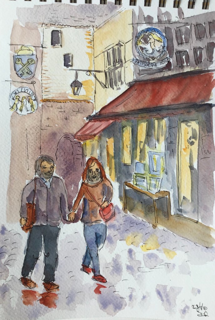 The virtual urban sketchers group have recently been sketching Mont St Micheal in Brittany using street view. I have been admiring the results and planning to have a go myself. We visited Mont St Micheal in 2013 so I looked back at some of the photos and picked this one to start with. The streets are narrow, cobbled and look like a set from Harry Potter!