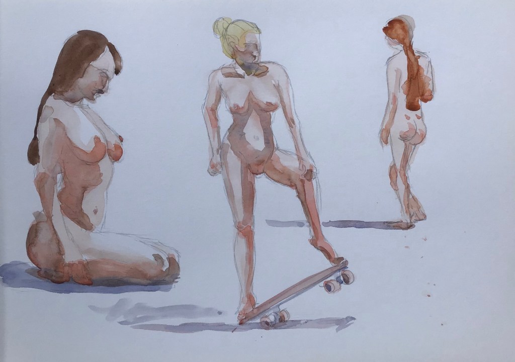 Today’s painting is an experiment using different types of watercolour paper. The spiral sketch book is cartridge paper, the four figures are on 130lb NOT watercolour paper and the other three are on a smooth watercolour paper. The conclusion is I need more practice of figure drawing! Apart from that I rather like different properties of all three surfaces although the watercolour paper probably doesn’t always need the pen work.