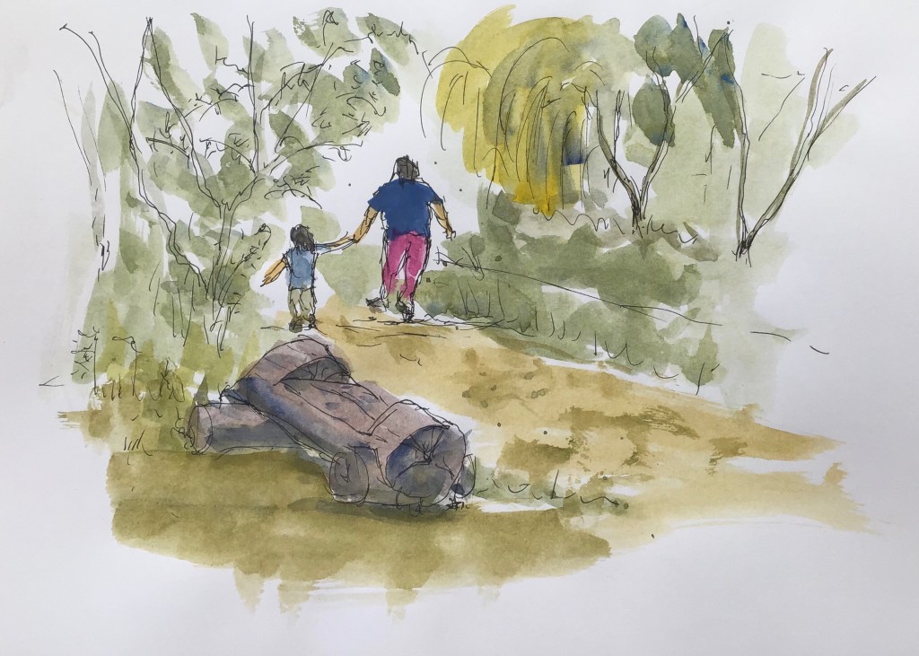 Here is a quick sketch I did at Canford Park SANG yesterday after a lady and her 6 year old daughter stopped to talk to us about our work. I reminds me a little of Winnie the Pooh the way they were holding hands although as I started this after they had gone I don’t remember if they were actually holding hands but I suppose that doesn’t really matter.