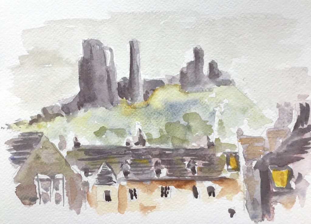 Corfe Castle was shrouded in mist this morning when we arrived to do some plein air painting with Poole and east Dorset art society. I found a bench in the churchyard with a great view of the castle and the Greyhound Inn. Unfortunately it was a cold and windy spot so I finished this little painting in record time and went off to find a coffee and a warmer place to sketch. This turned out to be the stone cross in the village square where I met some of the other artists, I will post the sketches from there tomorrow.