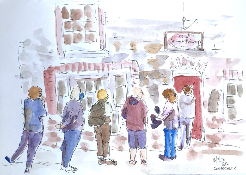 In the town square, Corfe Castle is the very popular village bakery. Yesterday there was an ever changing queue of customers waiting to buy pasties and sandwiches. I spent a happy hour sat by the town cross sketching them, a few came across to see if they could spot themselves in the picture.