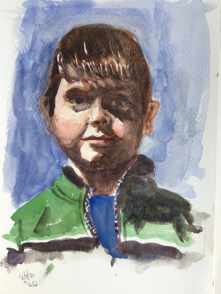 My intention was to paint a nice loose portrait letting the colour run and giving a spontaneous feel. The reality is I overworked it and made his face too fat then lost the bright sunny patches of light. Never mind, it’s only a piece of paper.