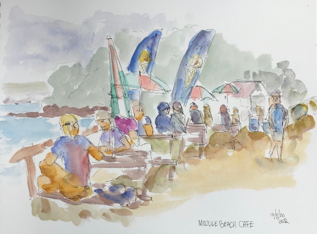 After painting on the beach on Thursday I went for a coffee at Middle beach cafe and was able to sit in the sun and sketch the other customers. The two girls on the table in front of me were deep in conversation and took no notice of me until they got up to leave and saw my sketch as they walked passed. They were very complementary and admired my work which gave me a warm glow of satisfaction!