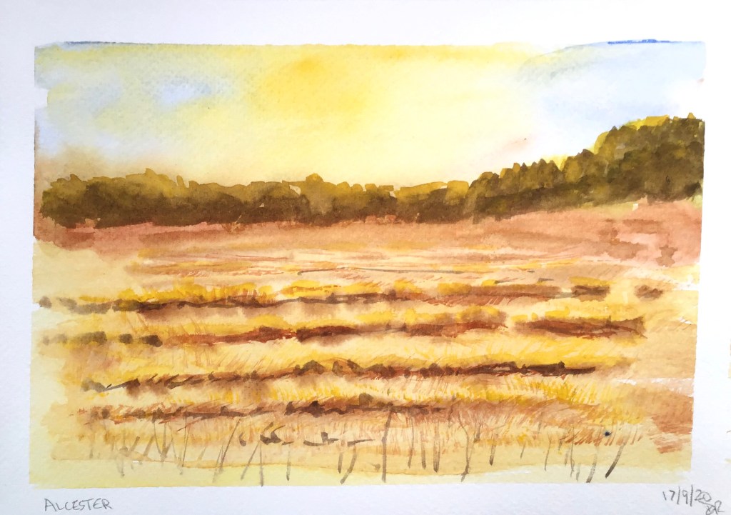 Had an evening walk with the dogs across the fields. The crop. Of oilseed rape had been harvested last week but the low sun glinted off the straw that has yet to be gathered in. The dogs waited patiently while I painted this although Nuala managed to destroy her tennis ball, it seemed a small price to pay to be able to paint and enjoy the countryside.