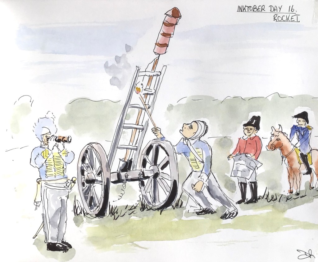 Inktober day 16 and today’s word is Rocket. The Congreve rocket was used in the Napoleonic wars by the British. They were notoriously inaccurate and generally caused chaos and confusion to both sides. They also scared the horses which is why the general in this picture is riding a pantomime horse!