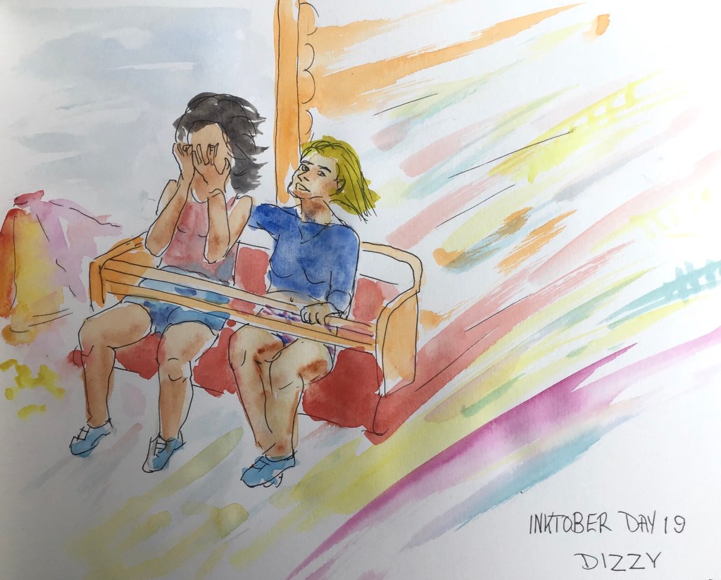 Inktober day 19 Dizzy. I think most kids love fairground rides but as we grow older we can visualise all the things that can go wrong with large mechanical structures! I have dangled under a helicopter on several occasions while on exercise with the Coastguard and been lowered into speeding boats but you wouldn’t get me on this ride for anything! I think one of the girls may agree with me.