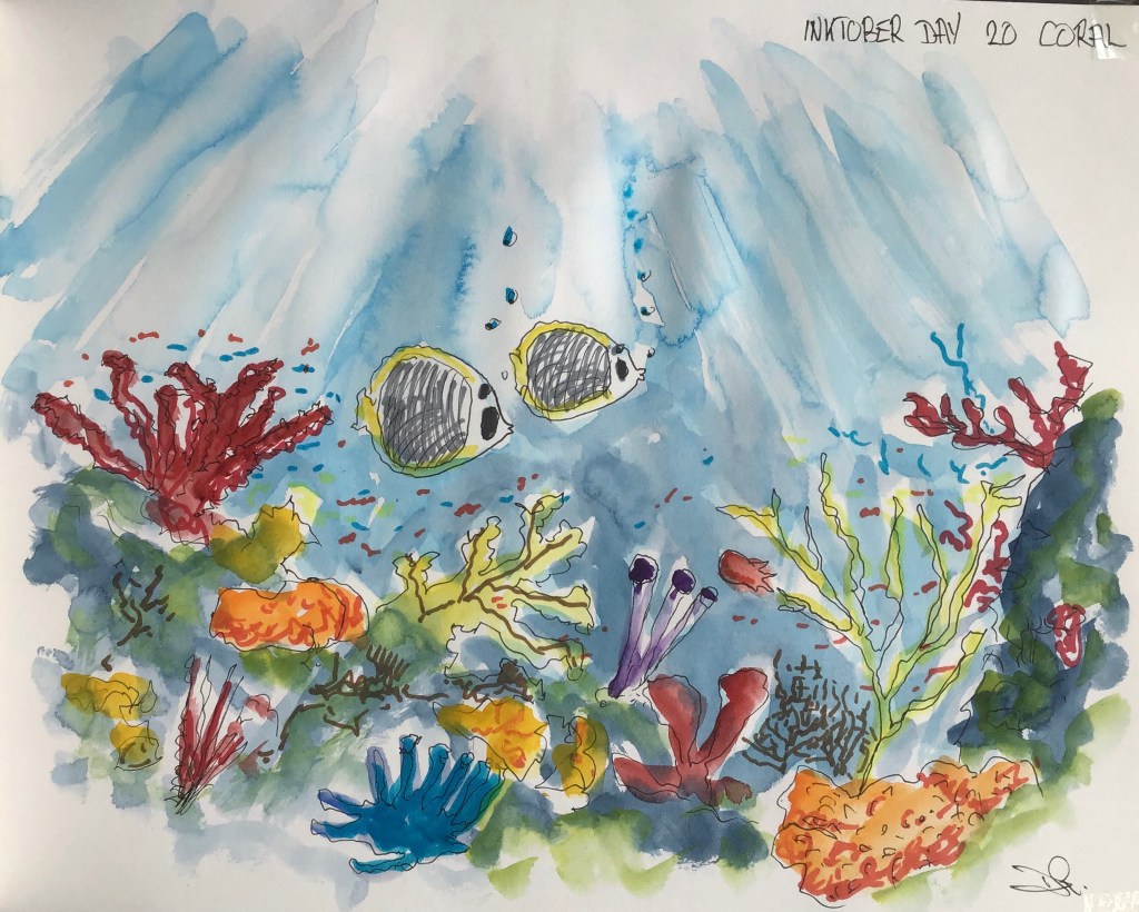 Inktober day 20 is Coral. I couldn’t think of a way to make it different so I made it colourful instead with a mix of watercolour and Spectrum Noir coloured pens.